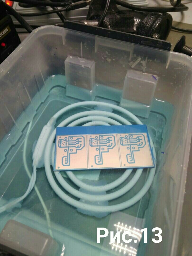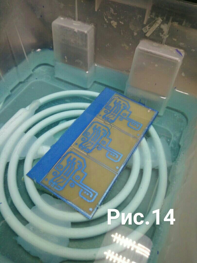 Состоит из одной задачи, после промывки положить плату в раствор (в моем случае персульфата аммония ), и наблюдать как раствор съедает медный слой стеклотекстолита (рис;13,14).