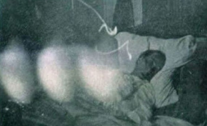 Мужчина на фото выглядит очень больным, может быть, почти мертвым. Снимок вызывает ужас. Есть и другие фото и видео, авторы которых утверждают, что они засняли душу, покидающую тело. Многие эксперты в паранормальных явлениях считают, что призраки могут не иметь форму тела. Они могут парить как дым. Впрочем, аутентичность этого снимка не доказана.