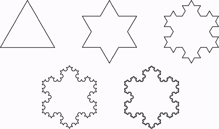 Разберём ещё один фрактал — снежинку Коха. Попробуйте сами понять, как она строится, изучив иллюстрацию: