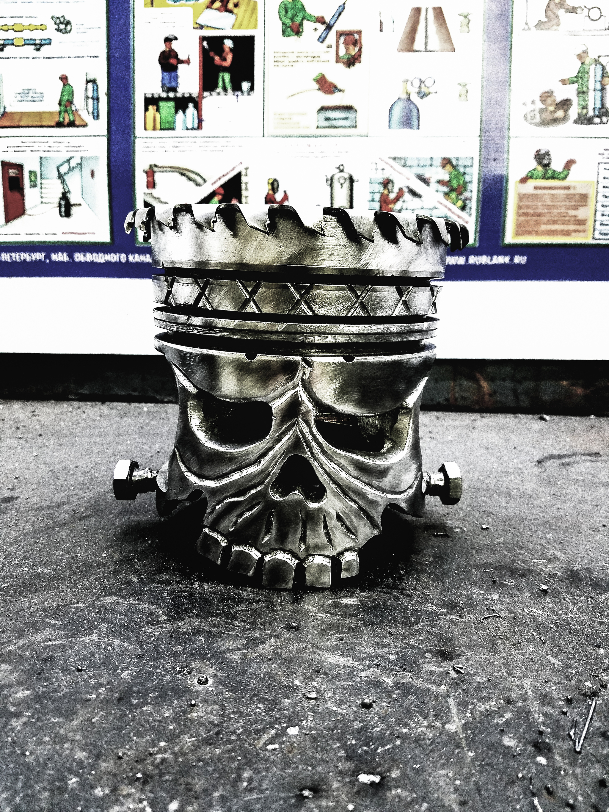 Выбиваем глаза зубилом. Гравером ровняем края, нарезаем полоски на лице болгаркой.