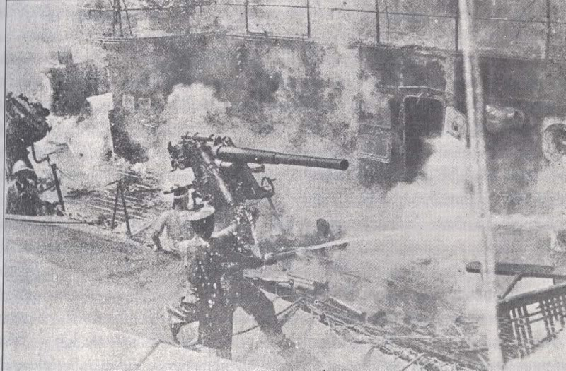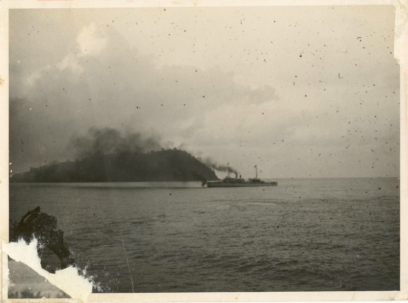 Авизо "Марн" маневрирует и ведет огонь, на заднем плане - остров Ко-Чанг: