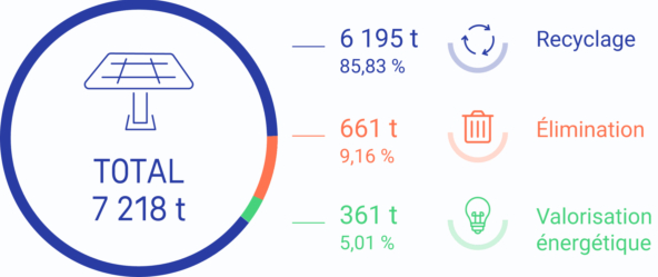 СП состоит в среднем на 75% из стекла полимера 10% и алюминия 8%, олова, серебра, свинца, меди и др. металлов. Французское экологическое агентство Soren отчиталось о переработке СП за прошлый год, общий вес поступивших на переработку в прошлом году панелей составил 7218 тонн, из них было переработано 6195 тонн или 85,83%, еще 361 тонн или 5,01% были восстановлены и продолжили генерировать энергию, 661 тонна или 9,16%, пошли на утилизацию.