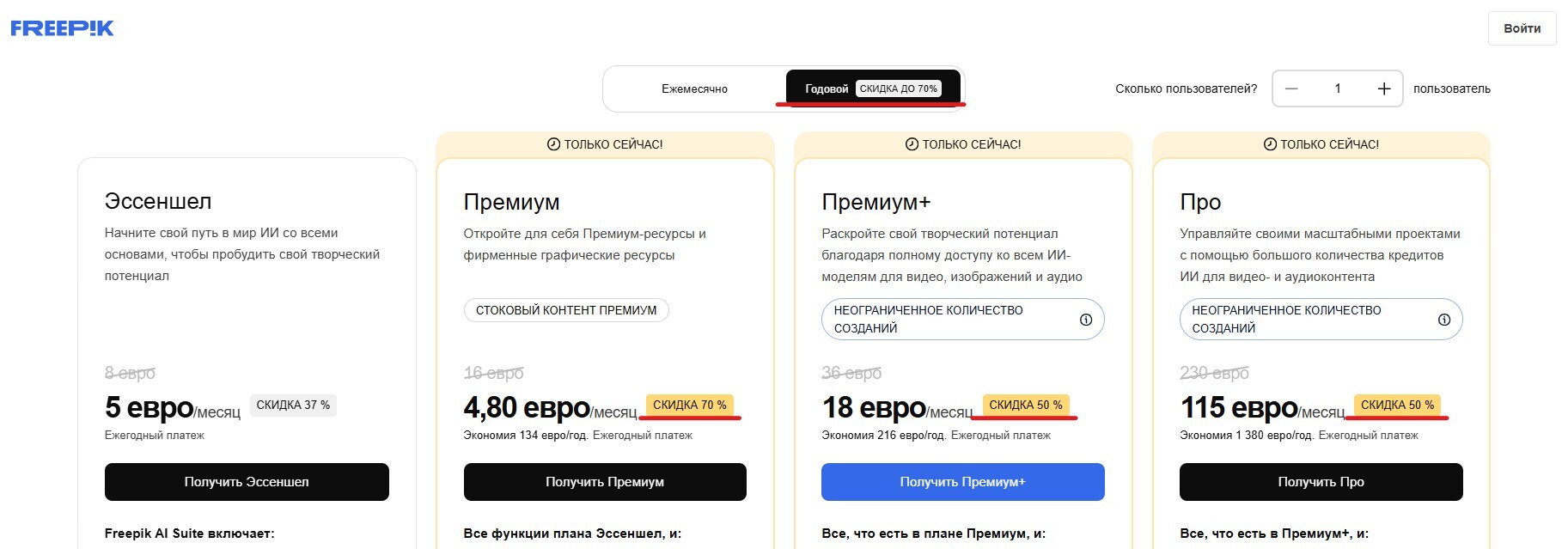 Сегодня Freepik предлагает несколько основных уровней доступа: Essential, Premium, Premium+ и Pro.