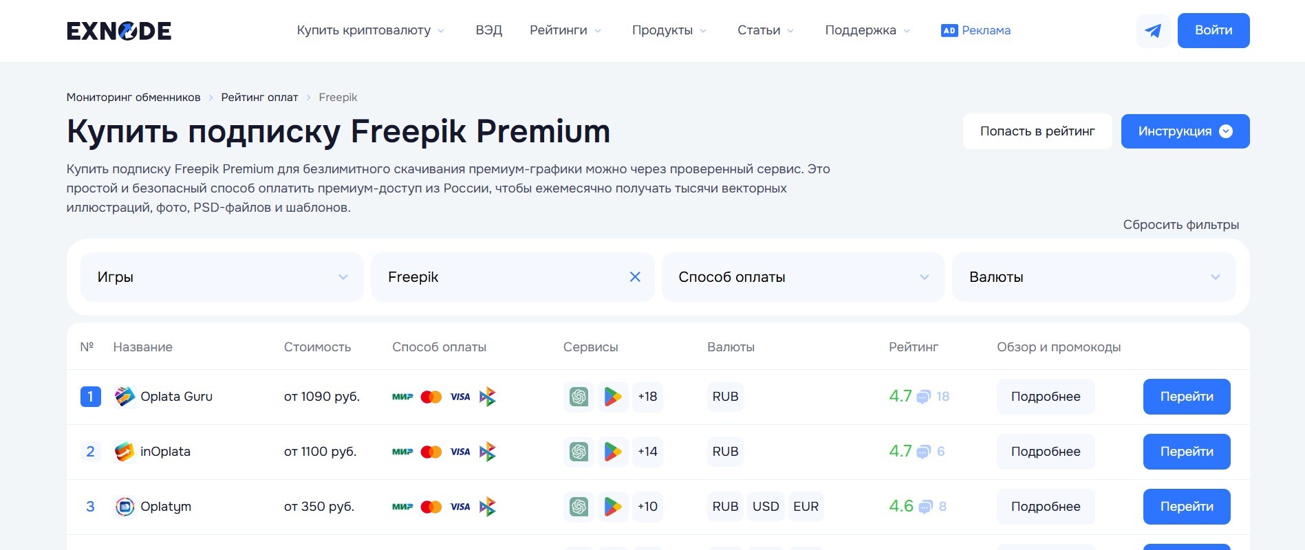 Рейтинги как раз и помогают найти такие варианты: в них часто указаны не только комиссии и способы оплаты, но и акции партнёров. Например, на Oplatym по промокоду EXNODE можно получить дополнительную скидку около 5% на оплату подписки Freepik. Аналогичные промокоды периодически появляются и у других сервисов, через которые можно купить подписку Фрипик в России.