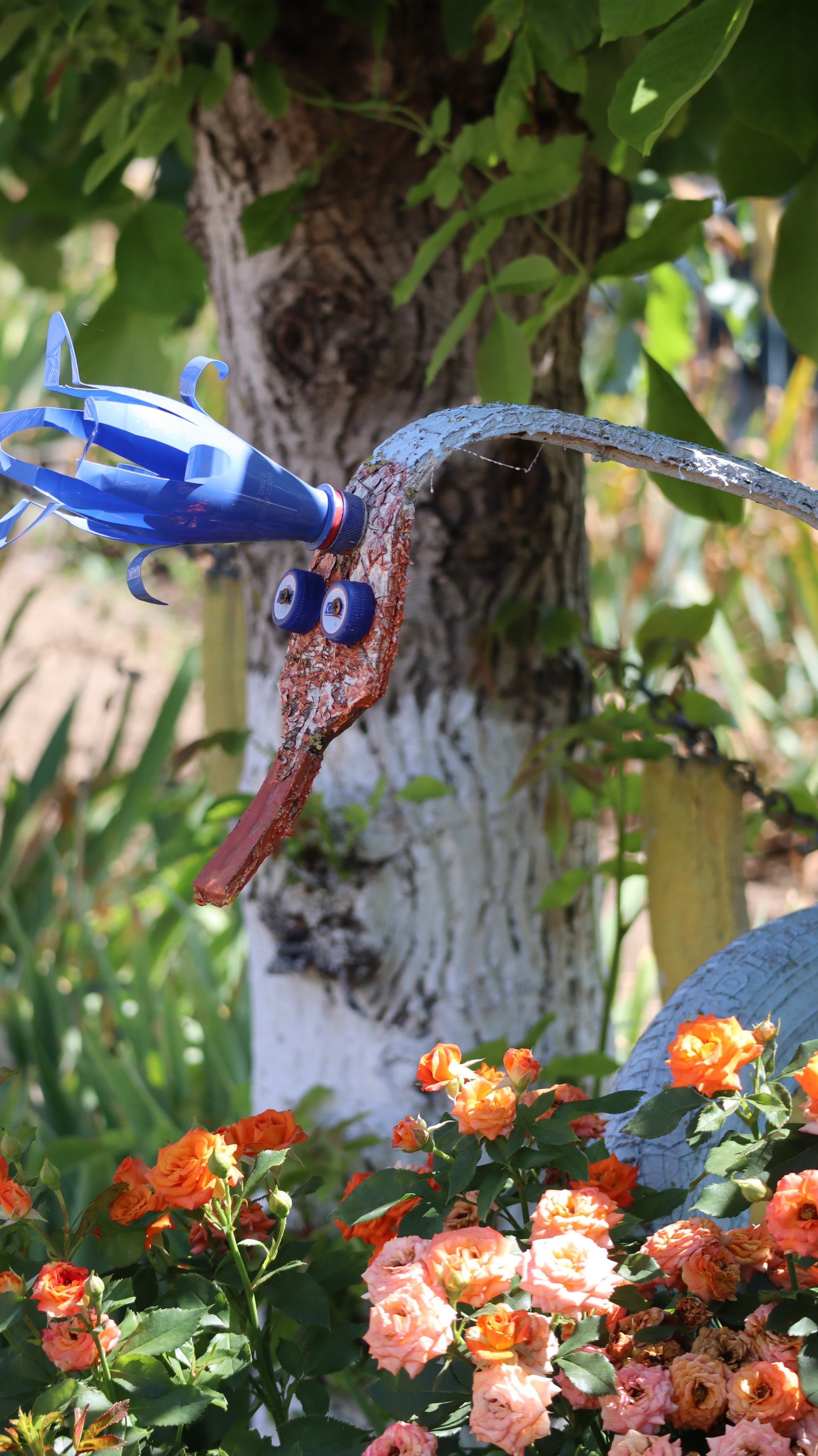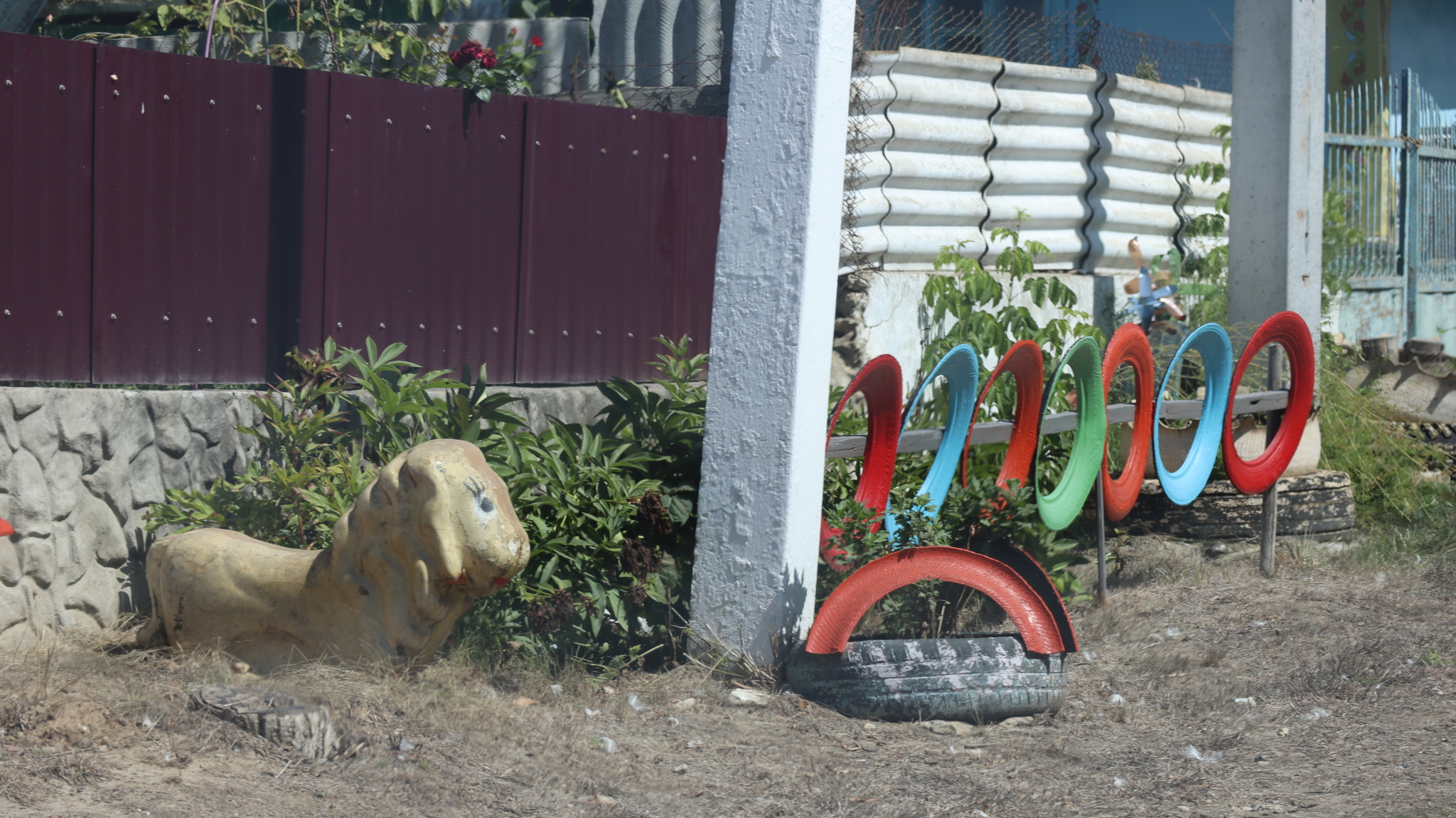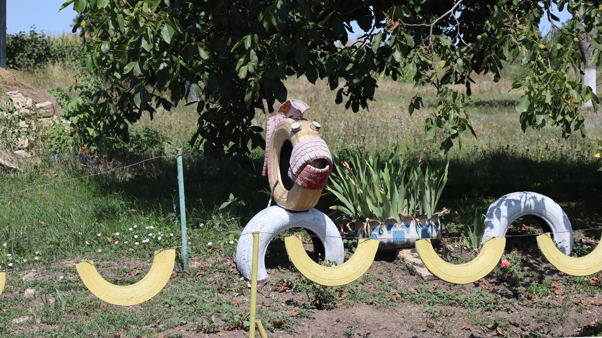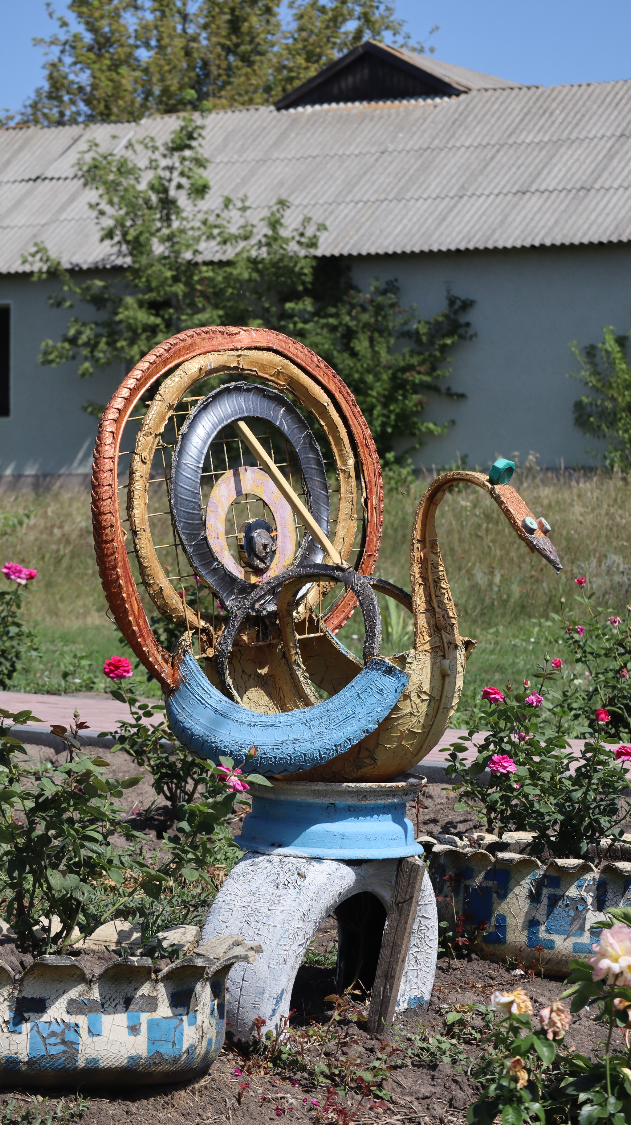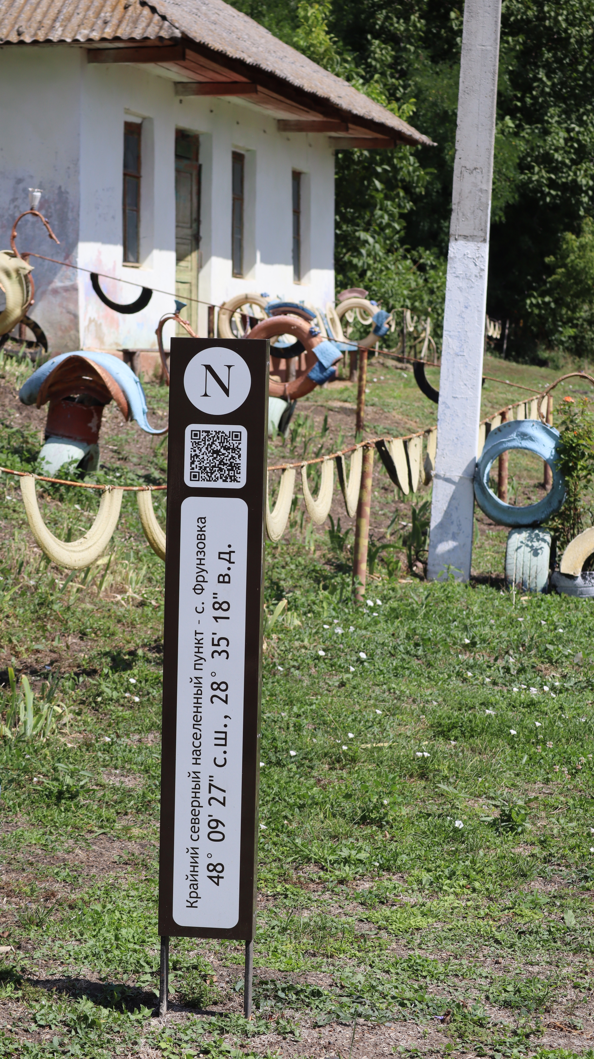 Но главное украшение Фрунзовки — не только её природная тишина. Это дело рук и сердца одного человека. Как я нашла из новостей 2017 года, его зовут Александр Мойсеенко. Его дом — самый яркий и узнаваемый в селе, настоящая художественная галерея под открытым небом. Всё началось в 2013 году с одной старой автомобильной шины, которую он, вдохновившись идеей из интернета, превратил в забавную скульптуру. Получилось. И понеслось.