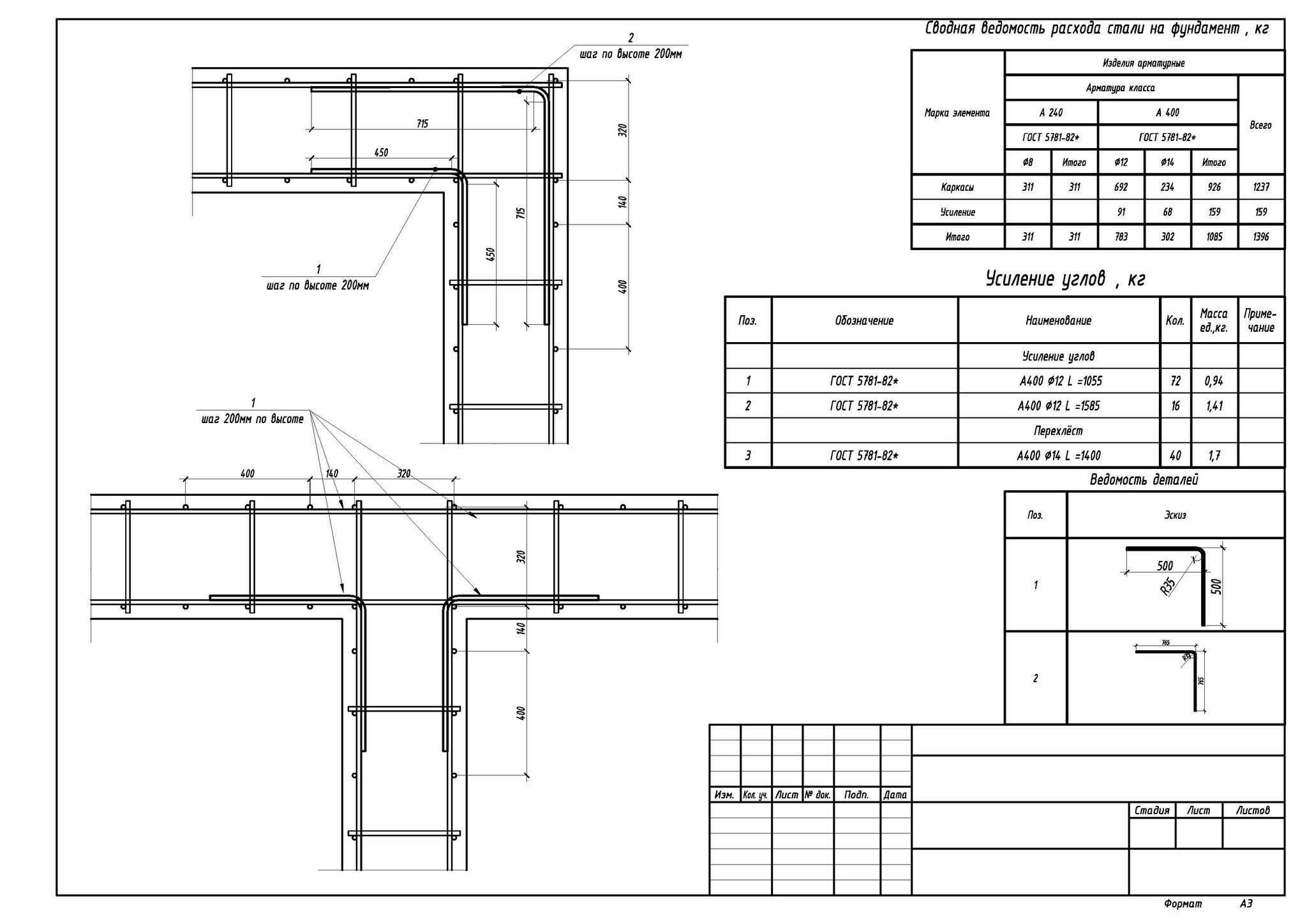 Ширина ленты была - 640мм под вентшахту, 500мм - наружные несущие стены, 400мм - ненесущие внутренние стены , 250мм - под внутренние перегородки. Глубина везде Отметка низа фундамента относительно земли - 1200мм.