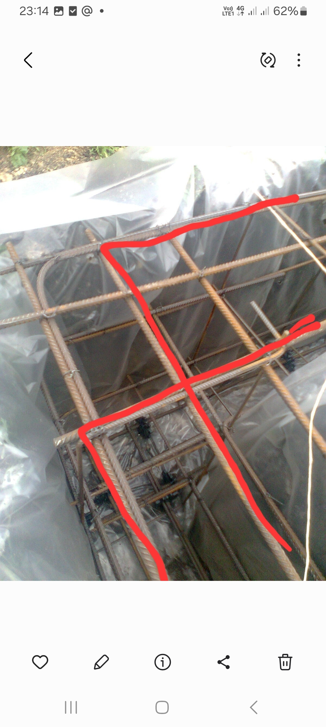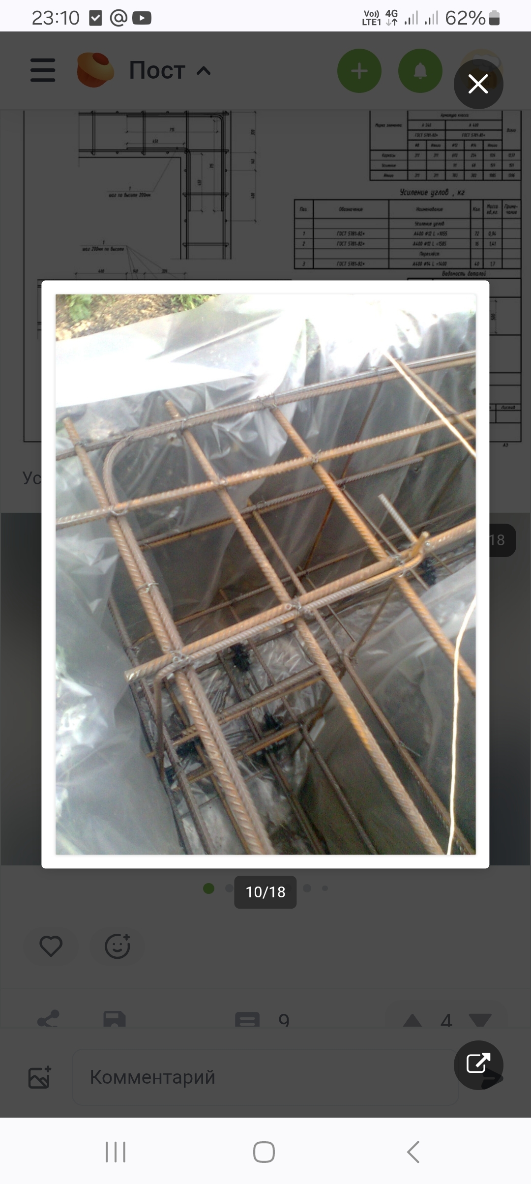 Разметка - при помощи геодезиста.В углах по осям установились колья из арматуры. Через метр от основных кольев устанавливались дублирующие на время копки. Копка осуществлялась мини-экскаватором с ковшом шириной 400мм - ушло часов. Объём земли - 38м3. Доработка грунта вручную. Грунт - суглинок с прослоями песка, воды нет. Лента армировалась вязаными каркасами - для удобства 8 продольных стержней из 12мм арматуры обвязанные хомутом из 8мм арматуры с шагом 500мм. Дно и края котлована выравнивались и слегка утрамбовывались. Затем по дну и стенкам укладывалась плёнка полиэтиленовая 200мкм для предотвращения ухода воды из бетона в грунт. Каркасы вязались непосредственно в траншее при помощи вязальной проволоки 0,9мм. Для создания защитного слоя применялись пластиковые звёздочки d=50мм. На углах ленты выполнялось усиление при помощи Г-образных стержней из 14мм арматуры. Вся лента за исключением стены по центру где арматура была 14мм, армировалась 12мм арматурой класса А500С. Расход арматуры - примерно 1250кг. Где было необходимо - обвалившиеся углы фундамента обрамлялись OSB плитой. Под вентшахту фундамент был в мини -опалубке.