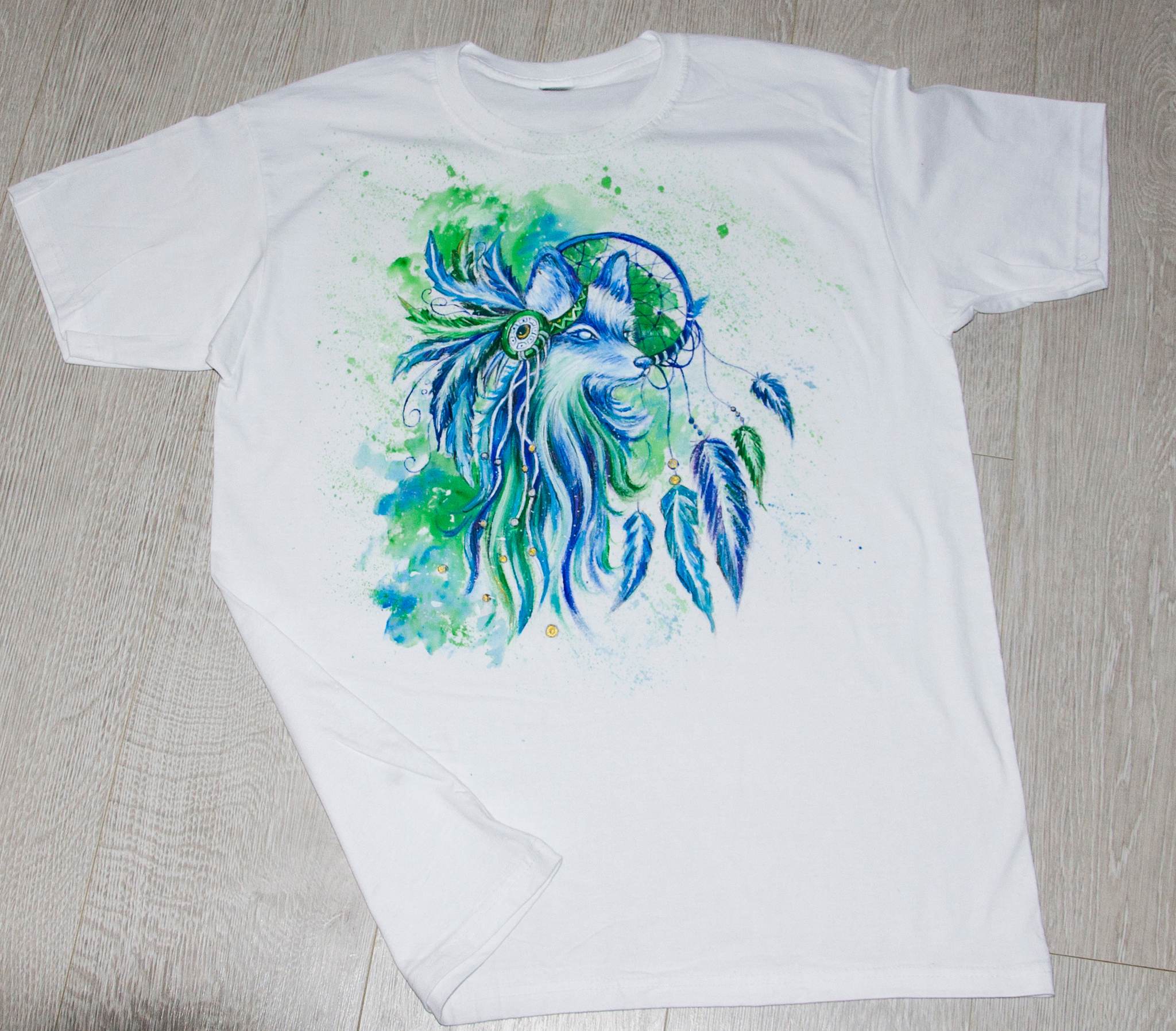 Вот такая получилась у меня лисичка с ловцом снов. Делала роспись для мужчины, есть такой же вариант, но женский с другими, более яркими цветами. Использовала акриловые краски для текстиля, картинка - из глобальной сети с некими авторскими изменениями.
