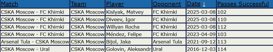 6. С 2009 года в играх ЦСКА было всего лишь шесть случаев, когда игрок "армейцев" делал минимум 100 успешных передач. Три таких результата были зафиксированы в прошедшем матче против "Химок".