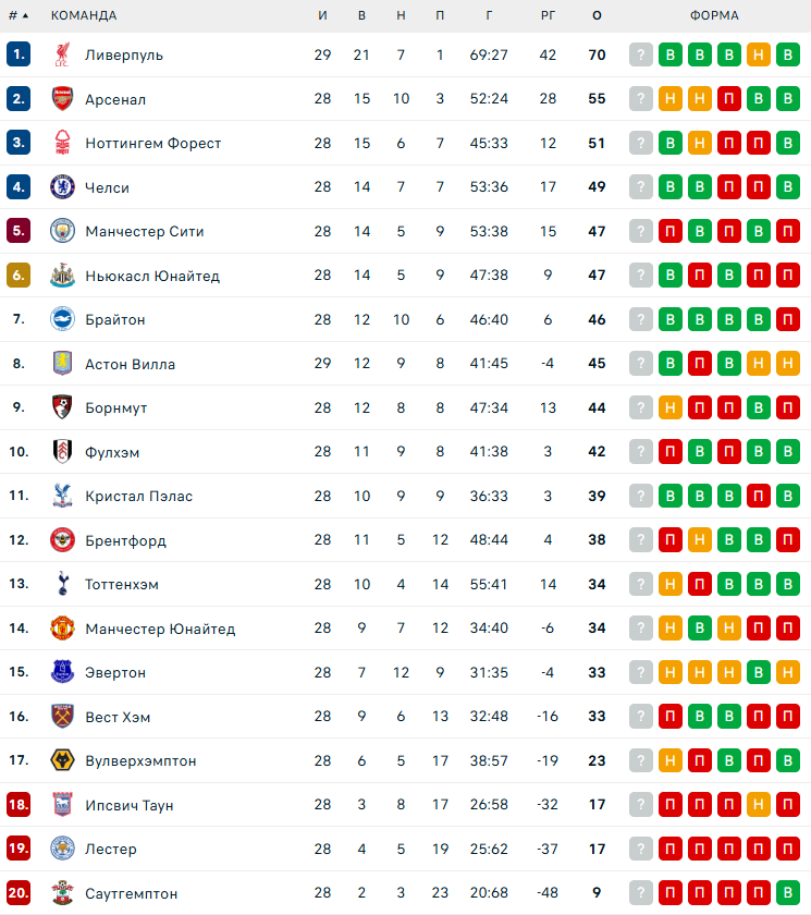 "Красные дьяволы" силами прекрасно исполняющего штрафные Бруну Фернандеша стопорнули "канониров" в их погоне за "Ливерпулем". На родине "Битлз" потеплело до +15. Синий же "Манчестер" вопреки многим прогнозам, по которым "лесники" должны были пасть ниц без особого сопротивления, в достаточно равной игре с небольшим преимуществом по количеству атак умудрился проиграть и опуститься на пятое место в таблице.