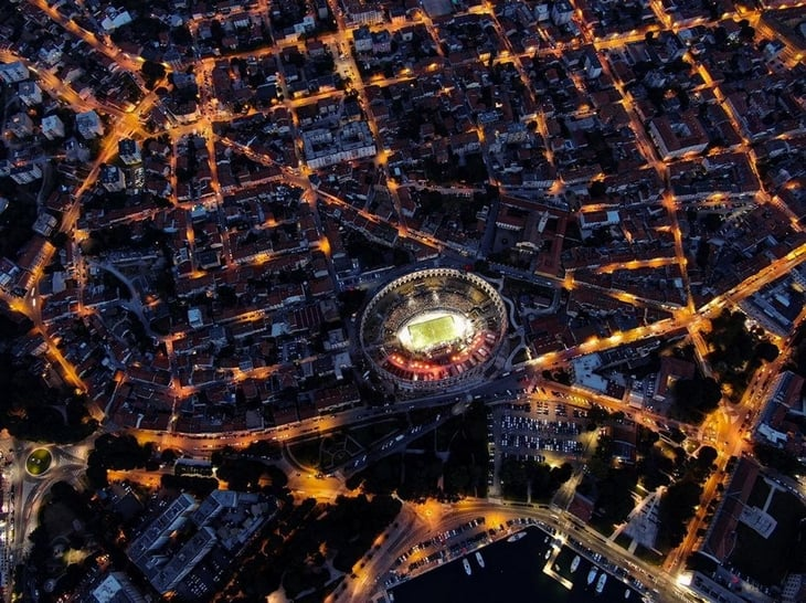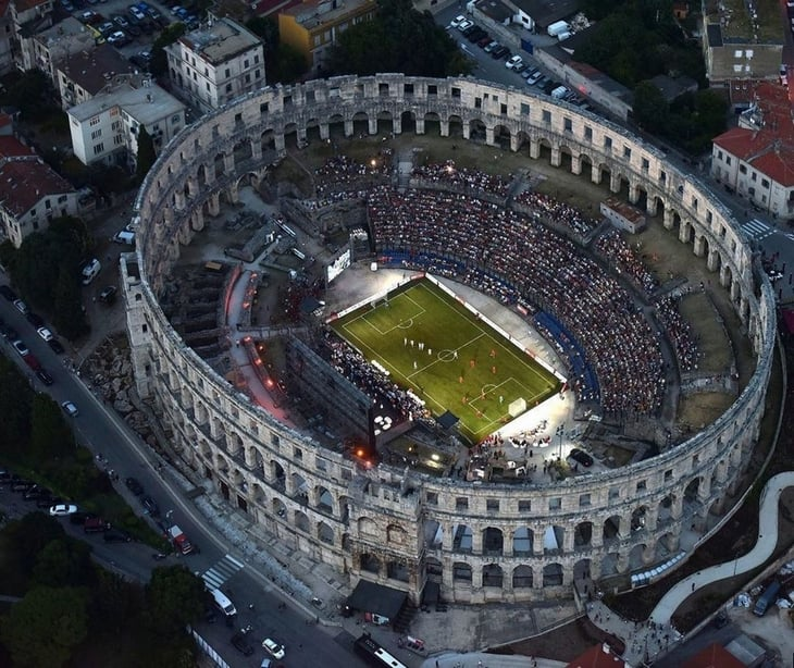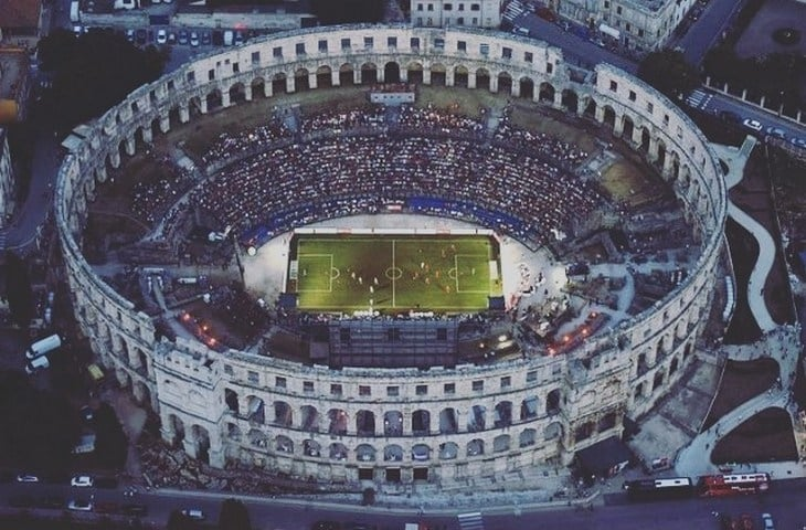 Это Пула арена в Хорватии, единственная из сохранившихся арен, которая имеет 4 башни и все три римских архитектурных ордера. При этом по своим размерам амфитеатр занимает 6-е место в мире среди подобных сооружений. Что интересно, он не охраняется Юнеско.