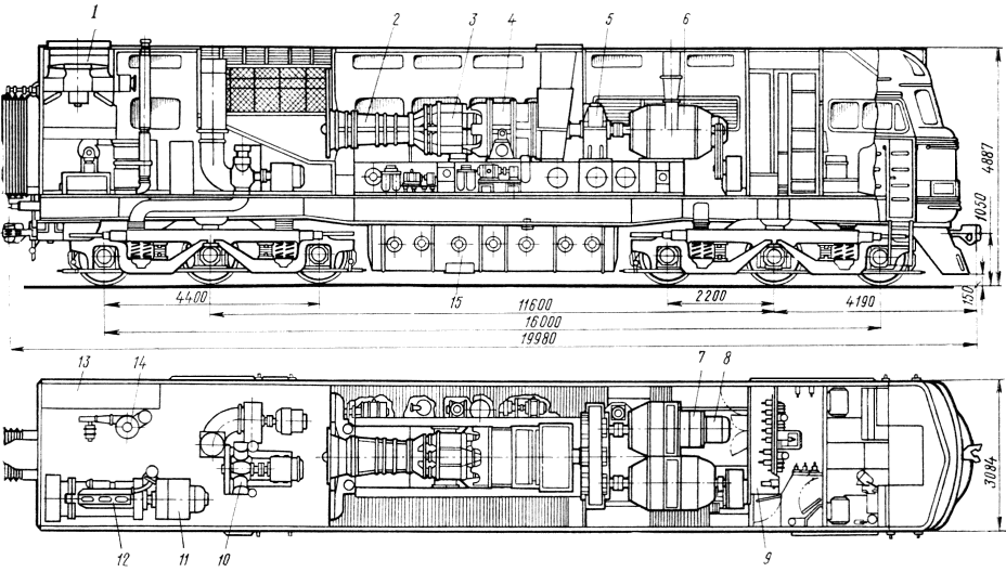 1 — холодильник; 2 — компрессор; 3 — камеры сгорания; 4 — турбина; 5 — редуктор; 6 — главные генераторы; 7 — вспомогательный генератор; 8 — возбудитель; 9 — высоковольтная камера; 10 — тормозной компрессор; 11 — маневровый генератор; 12 — вспомогательный дизель; 13 — бак дизельного топлива; 14— котел-подогреватель; 15 — бак тяжелого топлива