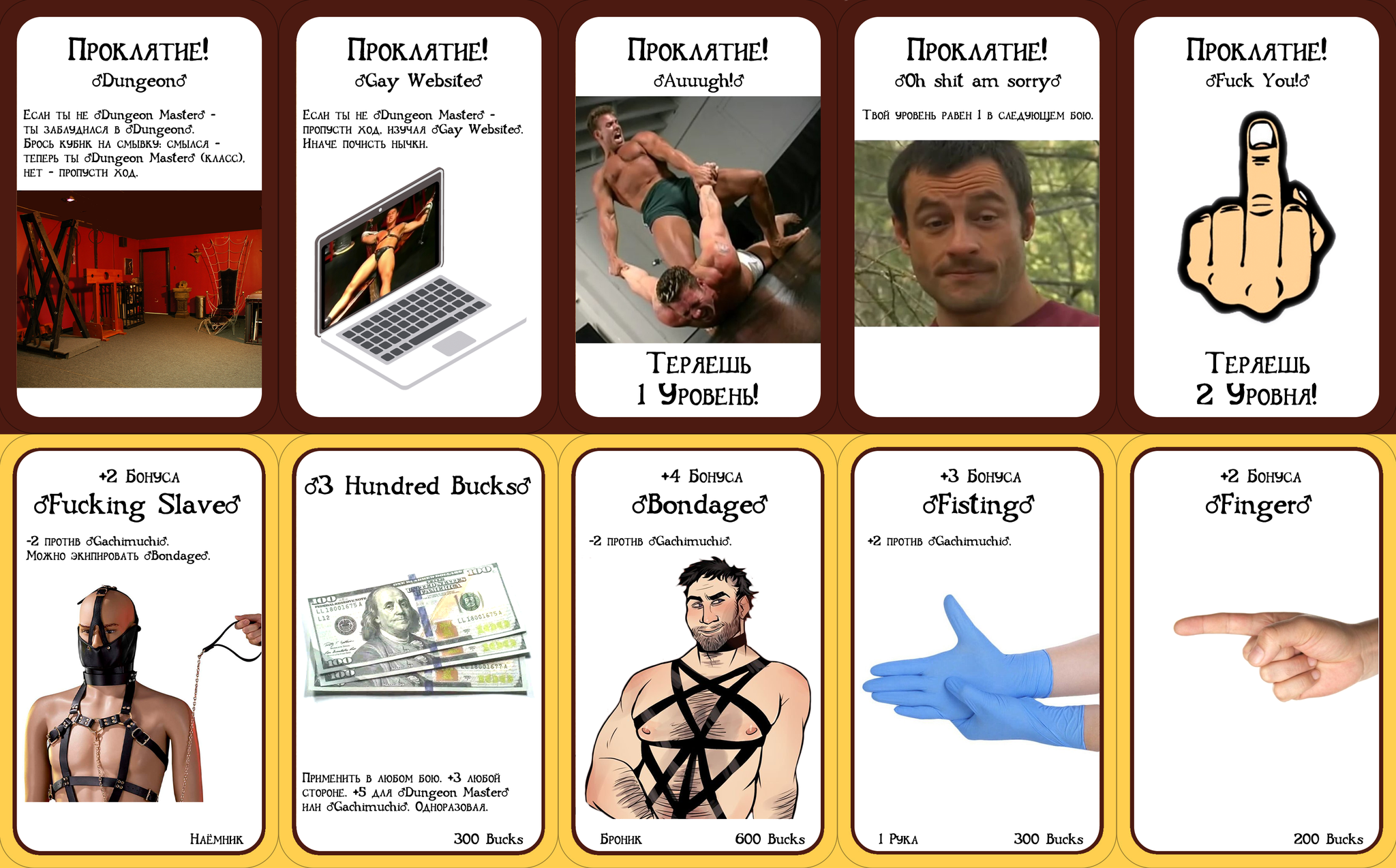 Привет, Пикабу! Не думаю, что от меня ожидают такой пост, но я всё-таки его опубликую =) Так вышло, что я люблю настолки, в частности Манчкин, и в особенности кастомный Munchkin Fallout 2.0 (про него тут даже есть пост). Классический тоже хорош, и на уходящей волне популярности Gachi-ремиксов, над которыми смеются многие мои знакомые, я решил сделать мини-дополнение к классическому манчкину, чтобы от души поорать субботним вечером над реакцией ничего не подозревающих игроков =) Тут всего 20 карт с самыми знаковыми ♂фразами♂, а именно: