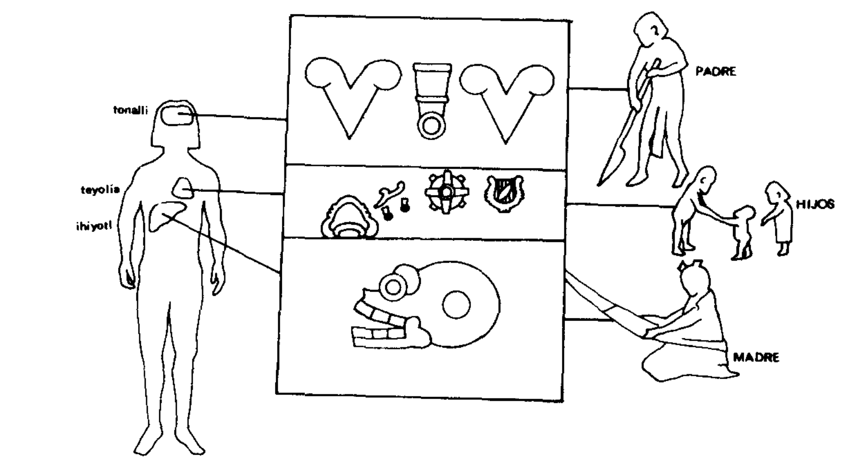 Три сущности души в человеке: тоналли (голова), тейолиа (сердце) и иийотль (печень) / Alfredo López Austin "Cuerpo Humano e Idealogía. Las Concepciones de los Antiguos Nahuas"