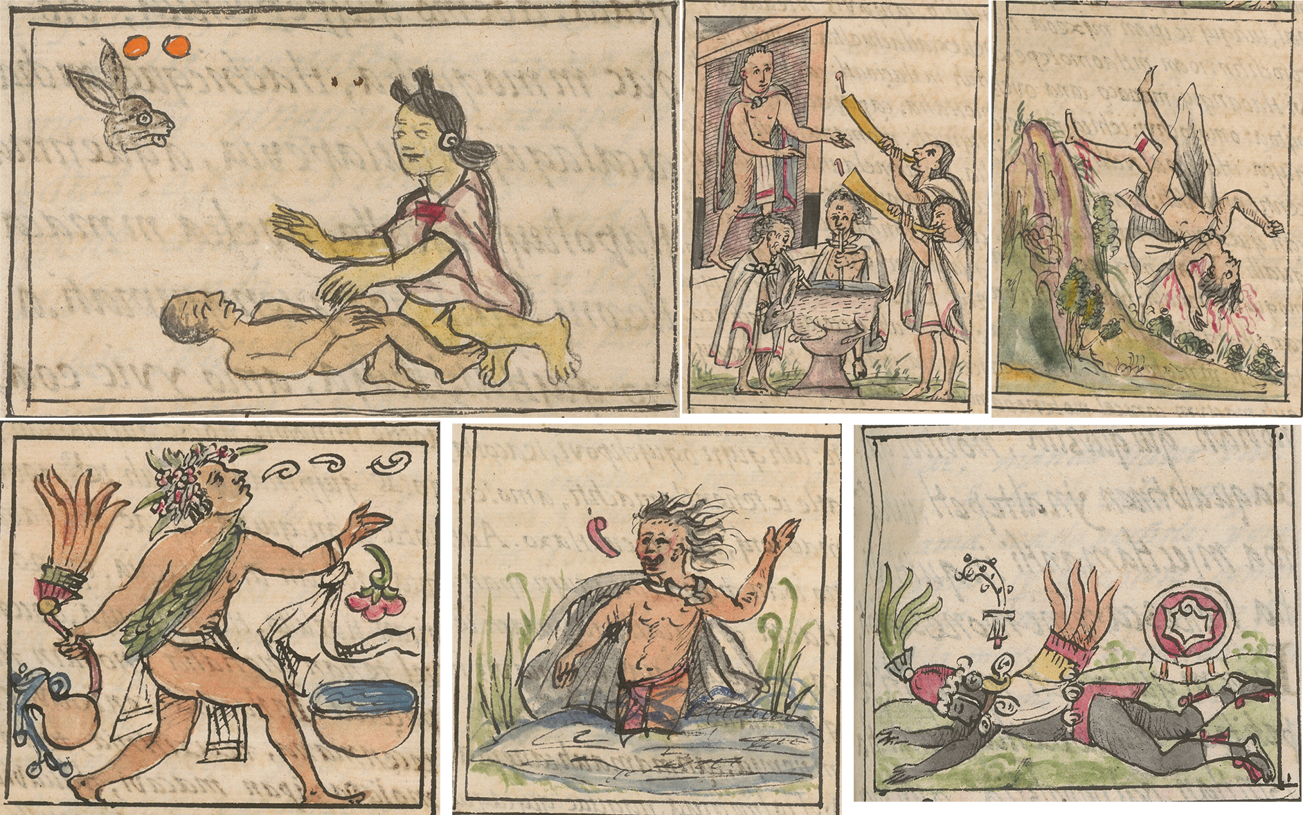 Ииногда прогнозы бывают благоприятными: например, ниже (левый верхний угол) мы видим Тлалока (слева) и Чальчиутликуэ (справа) около ребёнка:
