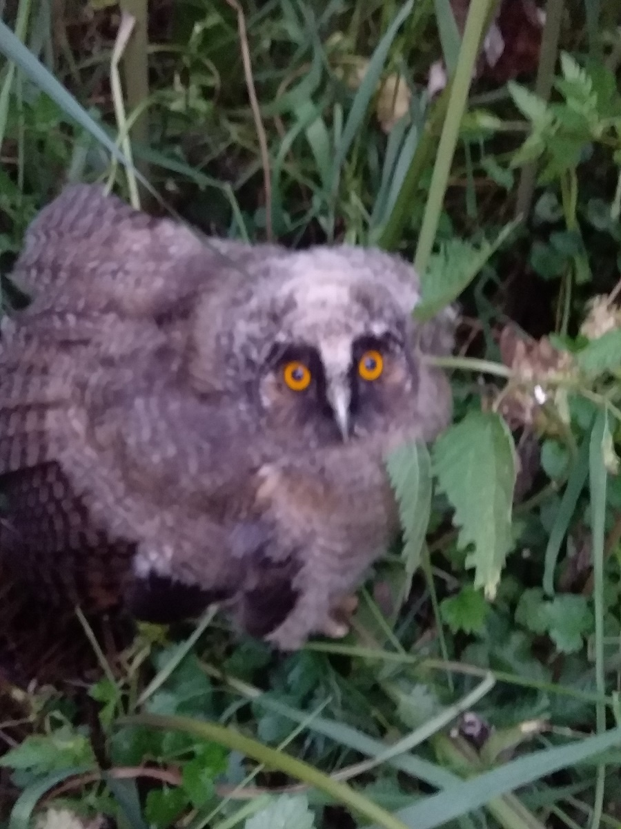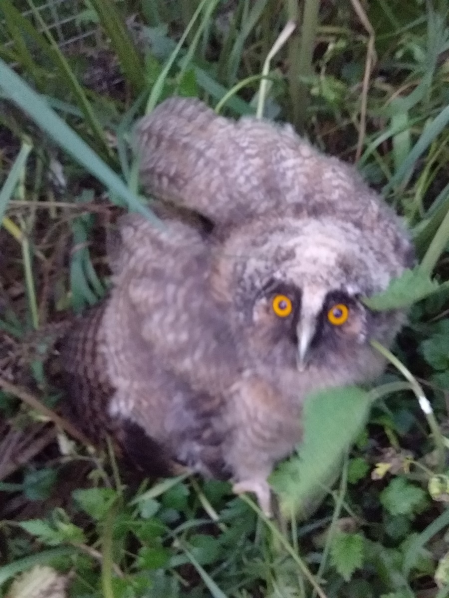Птенец ушастой совы. Глазищи у него очень красивого интенсивно-оранжевого цвета. На фото они бледнее. Он нас увидел и начал нас пугать. И шипел, и клювом цокал, и крылья раскрывал, превращаясь в шар, вот так: