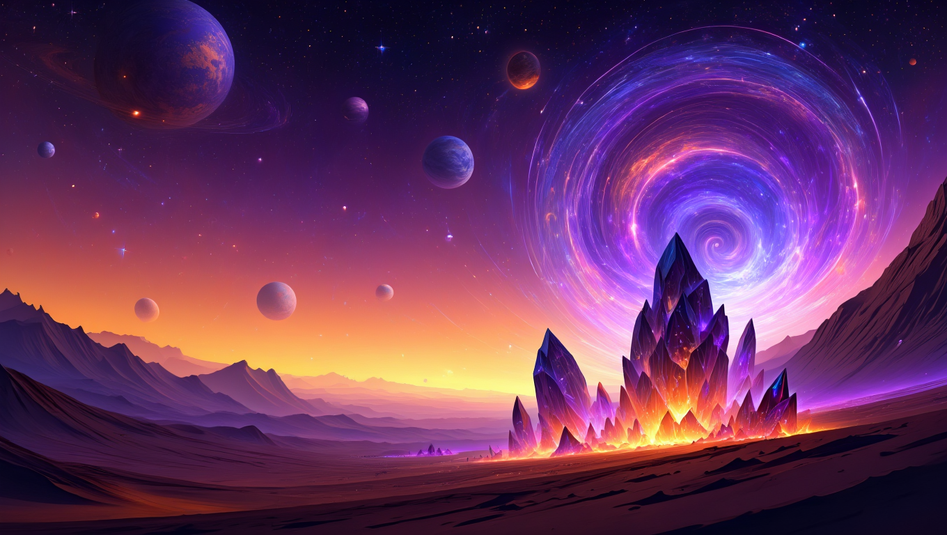 1 EvPix Галактический рассвет 8 месяцев назад Арты нейросетей Нейронные сети Обои на рабочий стол Вихрь Спираль Планета Космос Рассвет Кристаллы Горы Ещё 0