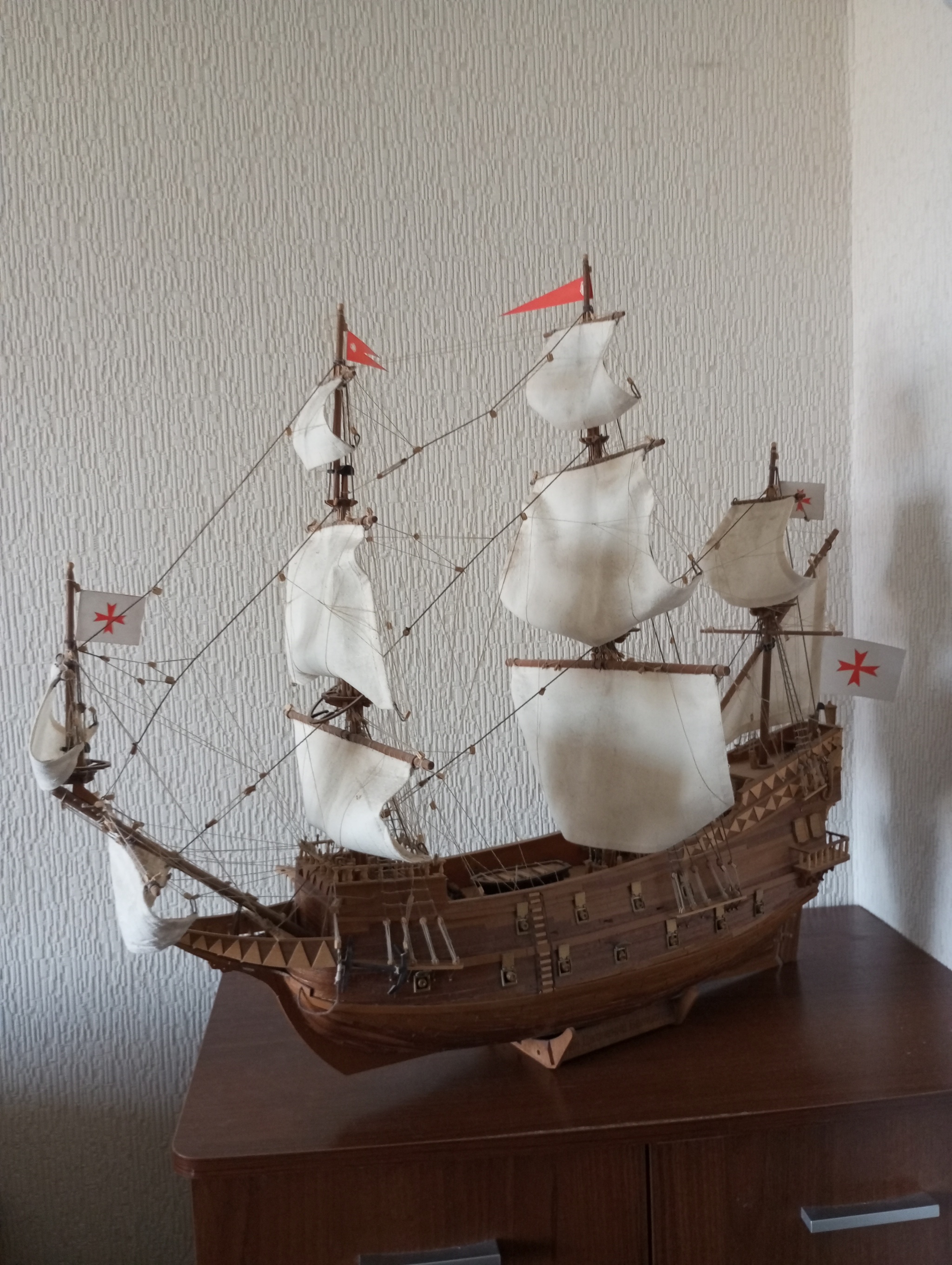 21 maks2727 Галеон Сан Джованни Батиста 1 год назад Точная уменьшенная копия парусного судна. Делали все новогодние праздники и ещё 2 месяца. Корпус без малых деталей делал я, остальное супруга. [моё] Модели Парусник Ещё 0