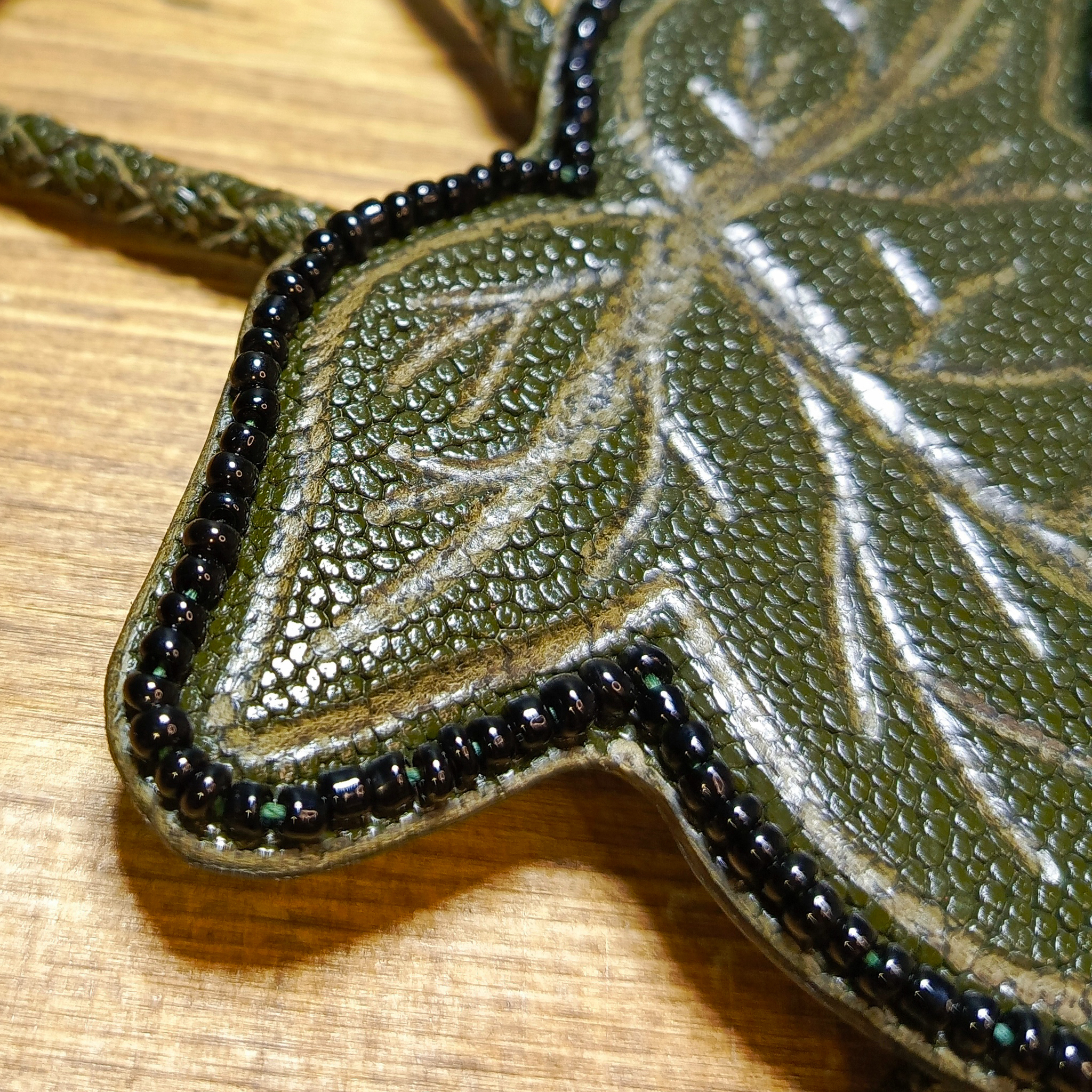 Ещё один аксессуар, который, вы больше нигде не купите и не найдете. Кожаный галстук Боло, он же галстук шнурок. Шнур сплетен из натуральной кожи, вручную. Зажим (лист), так же изготовлен из натуральной кожи, между двух слоев - вклеен пластик, для формы. Это не рисунок, это вырезанные вручную шрамы, зашлифованные и заполированные. Па Канту листа пришит бисер (решил поэкспериментировать).