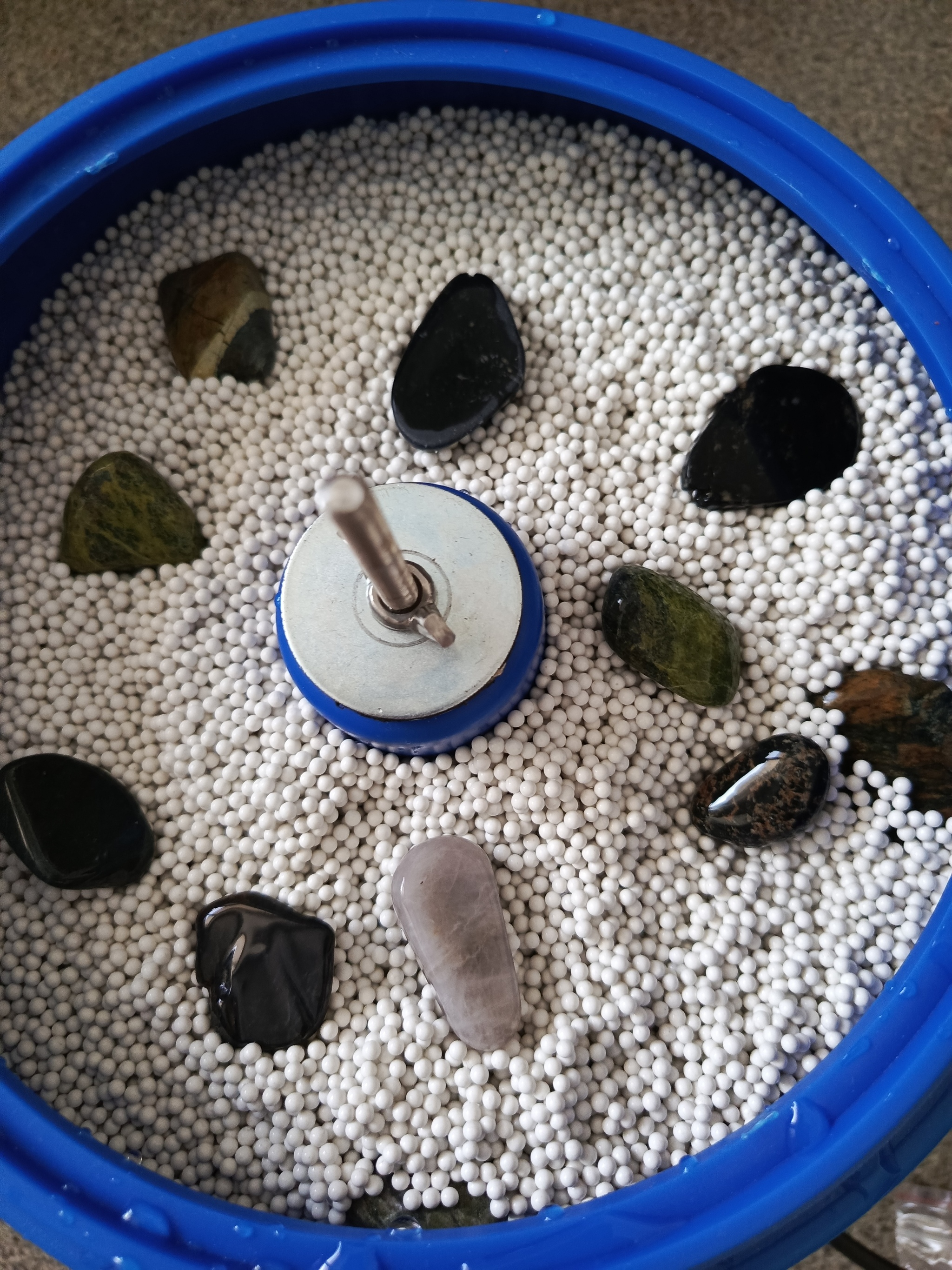 К этому времени пришла моя виброгалтовка. Увидела очень приятную цену на озоне и не удержалась. 2кг фарфоровых шариков 3 мм уже было, ещё три заказала. Закинула камни в галтовку, добавила алмазной пасты.