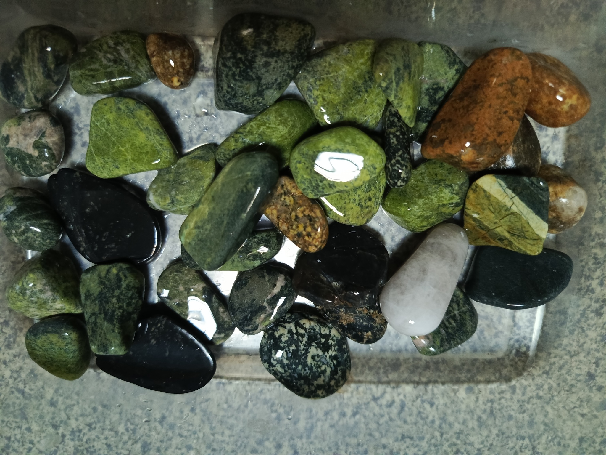 Итак, решила провести эксперимент и посмотреть на сколько в идеале можно довести камни в галтовке. Поэтому для удобства напилила камни на станке на небольшие куски, затем на шлифовальном станке сточила края. Решила, что на станке уйдет минут 15, а в галтовке не известно сколько, но явно больше. То, что края бы сточились и в галтовке, я не сомневаюсь, так как это уже пробовала.