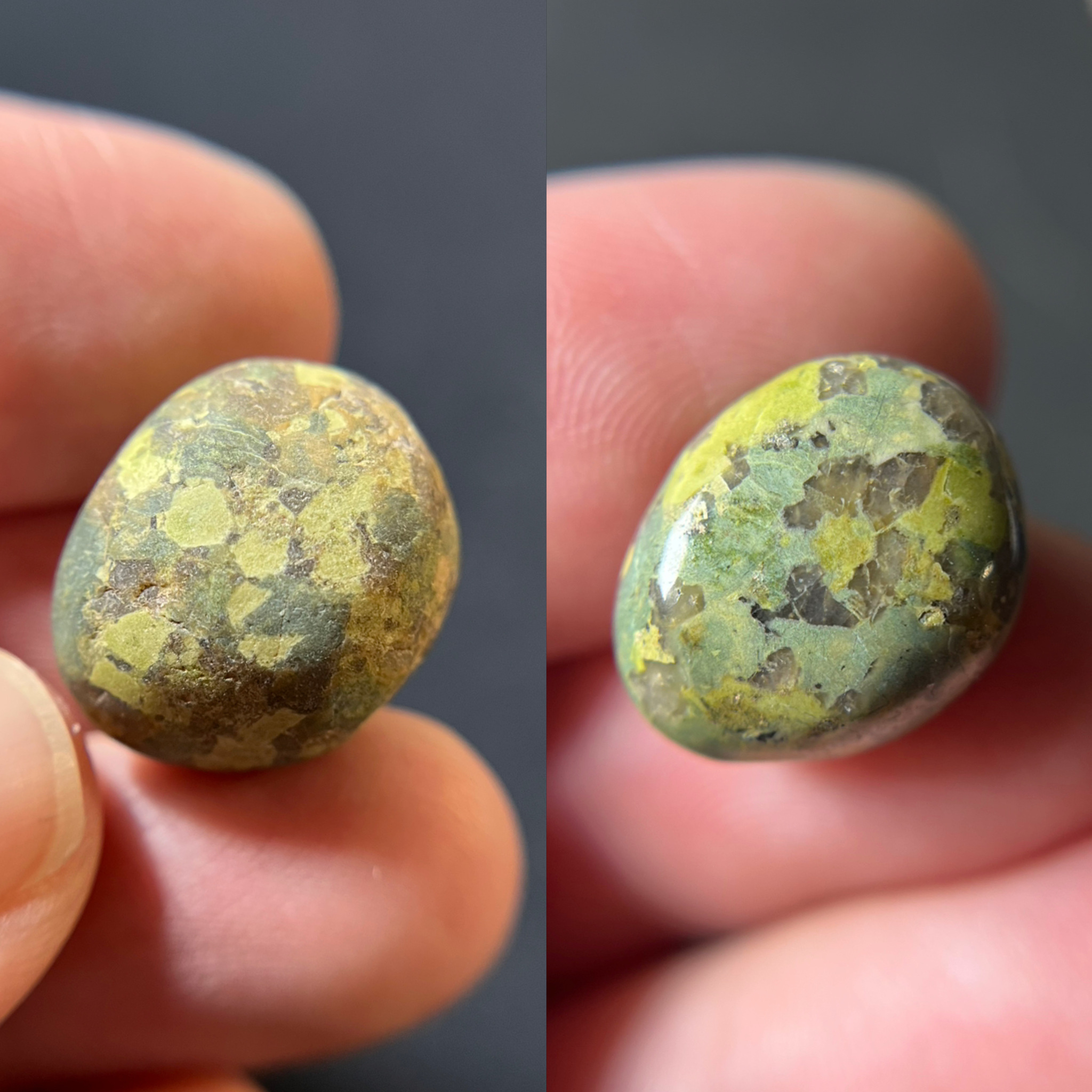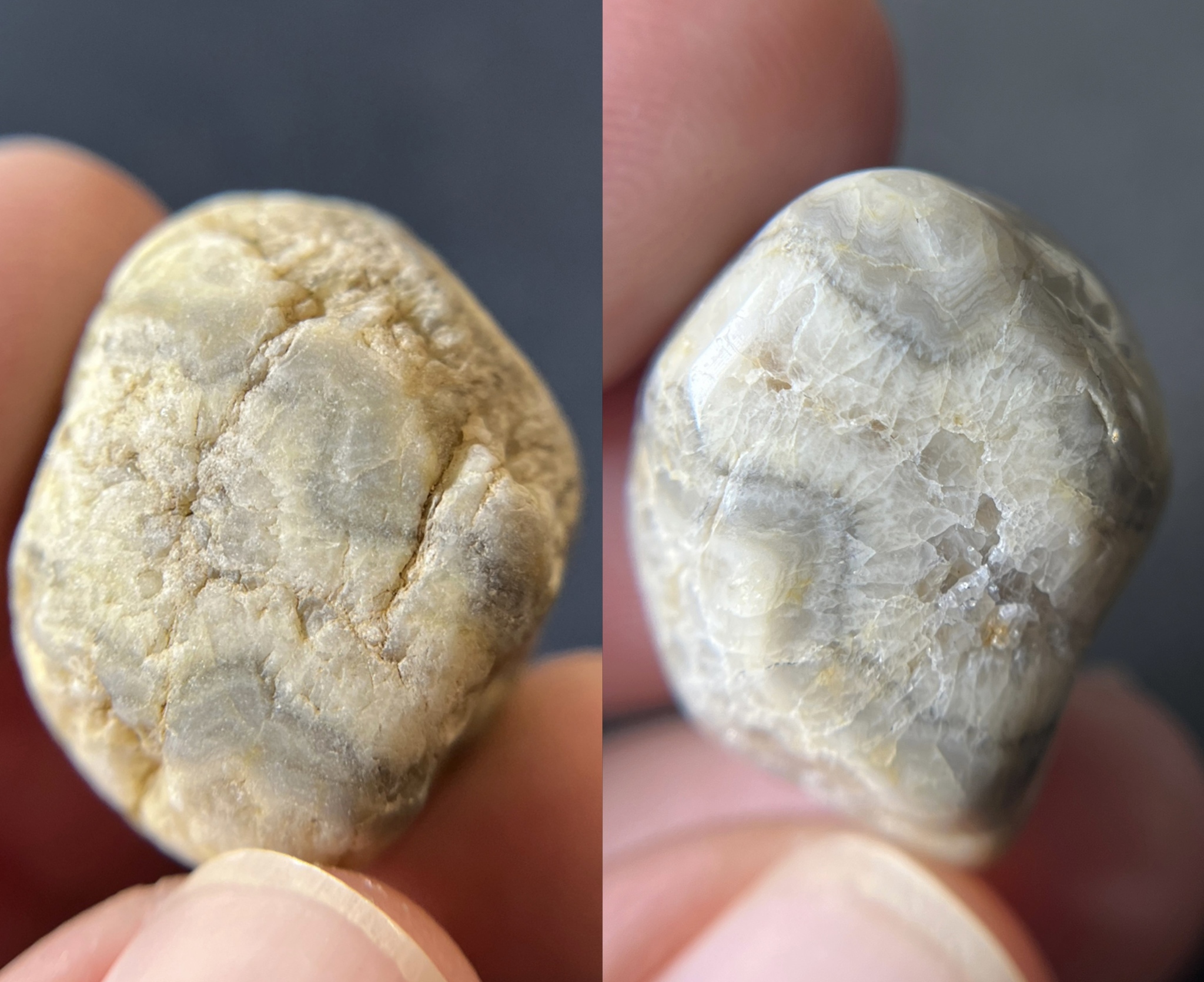 Вот такой результат вы можете получить, если просто закинете понравившиеся камни в барабанную галтовку. На многих камнях присутствует белесая сетка.