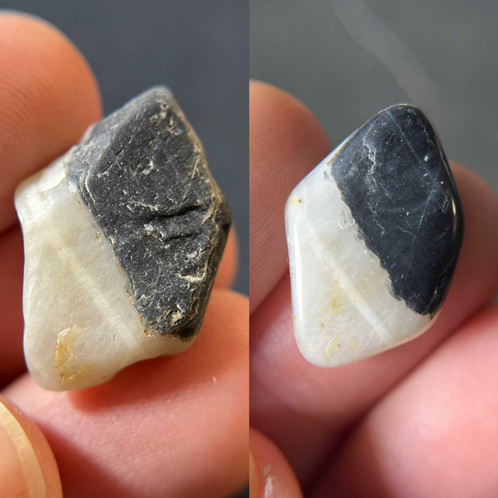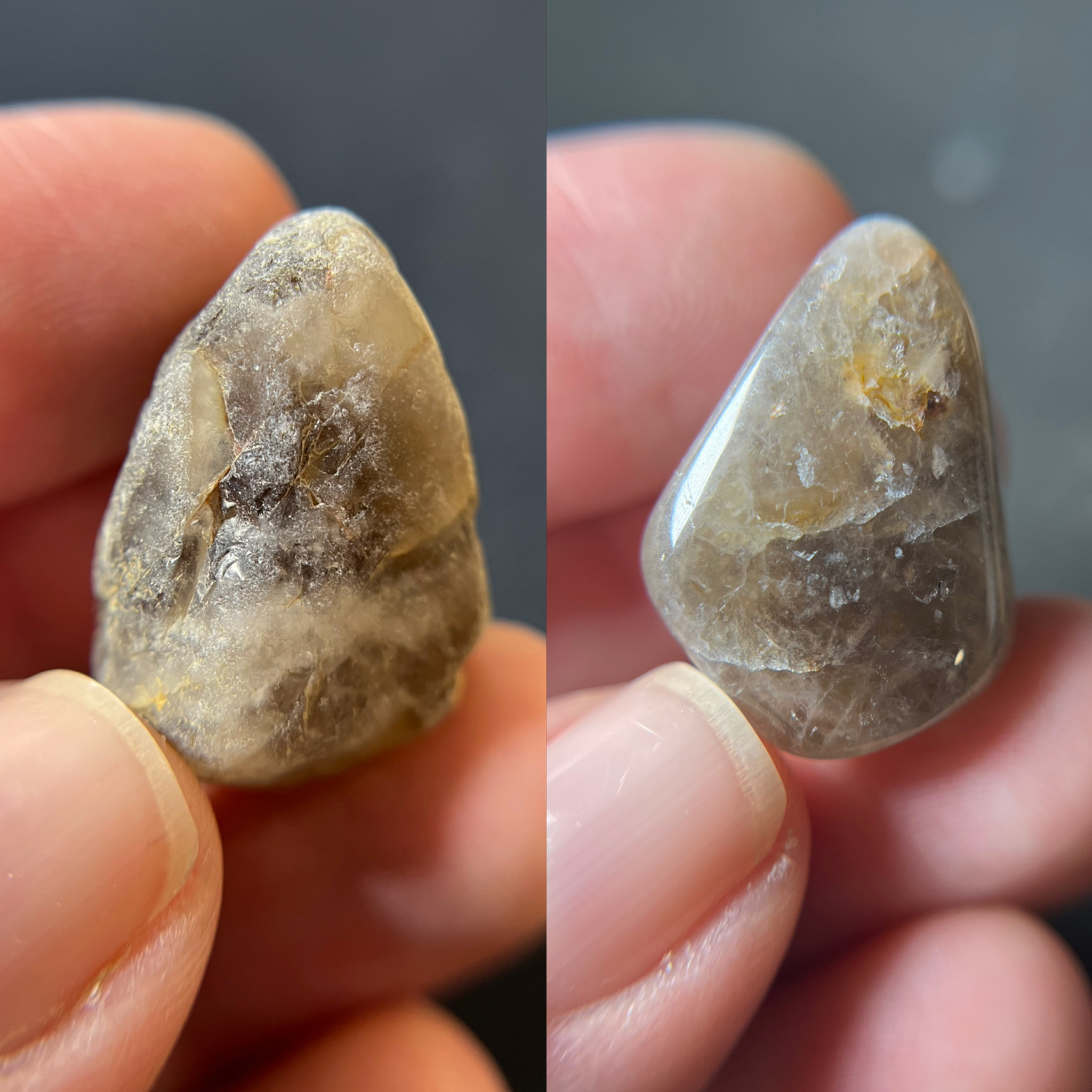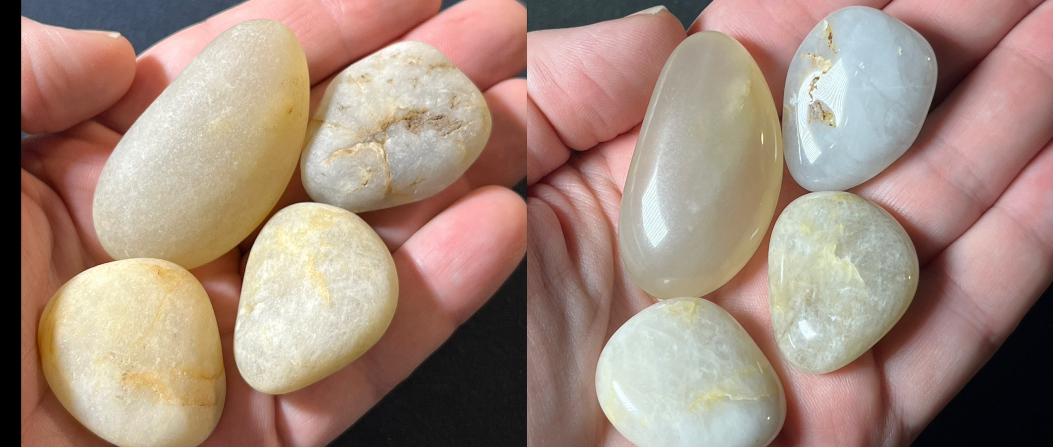 Особенно мне понравилось, как стали выглядеть кварцы после обработки. Если сам камень твердый, без трещин и уже имеет форму гальки, это хороший материал для новичка.