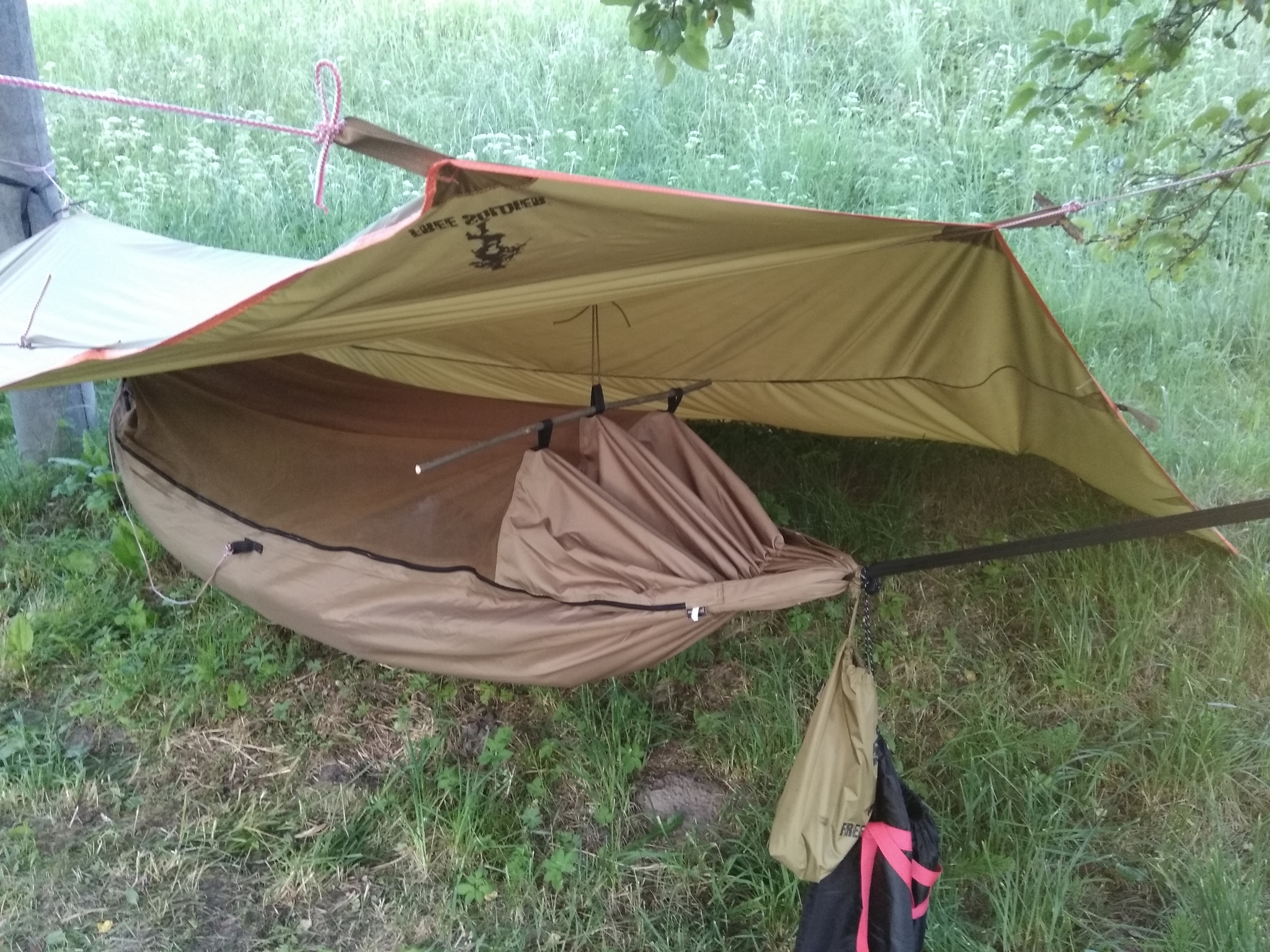 Мой любимый элемент снаряжения — гамак. И не просто гамак — а с сеткой и тентом. За прошлый сезон, при проводимых в лесу каждых вторых выходных, а то и выезжая на неделю-две, открыв сезон (под Питером!) в 20х числах апреля и закрыв на последних выходных сентября, я не спала в палатке ни разу. Незачем. В позапрошлом году в палатке, кажется, спала раза 4. А может, меньше.