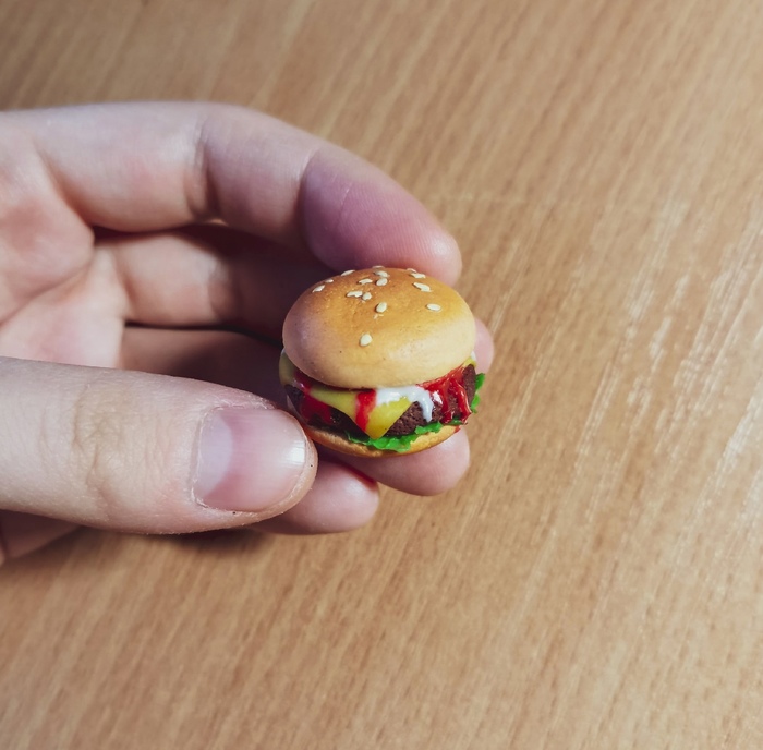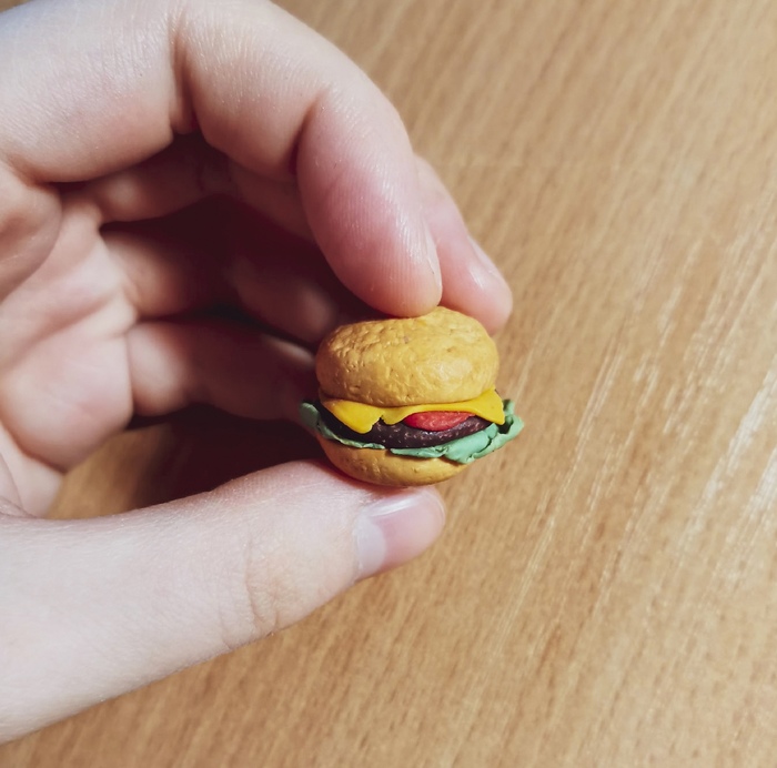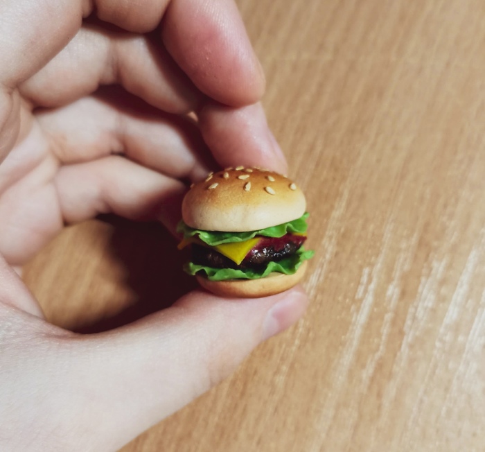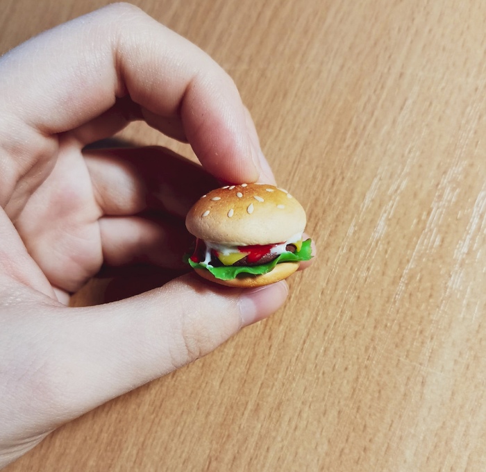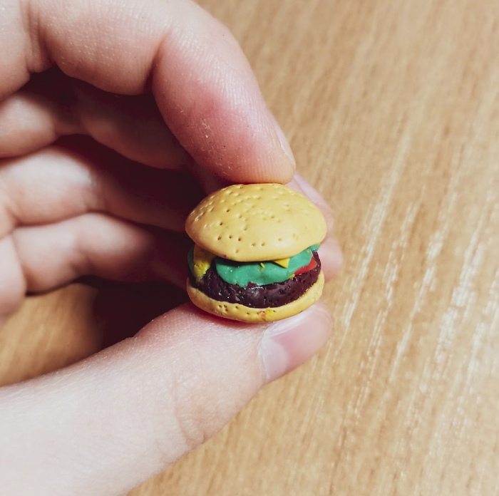 Первый гамбургер. Где-то 2016 год. Тогда я только начинала осваивать навык лепки. Когда я слепила его, я искренне считала, что он получился супер-реалистичным. На самом деле, как видите, он далек от идеала: