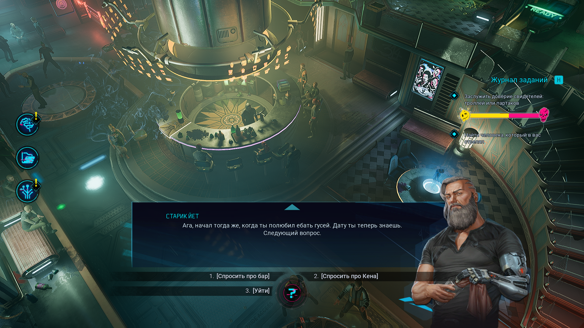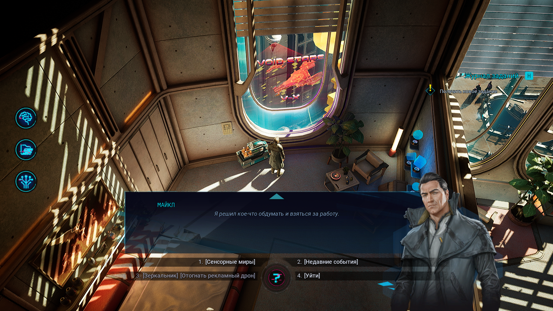 Полученные очки в аспектах можно тратить на прокачку. Она тут простая и подразумевает прокачку четырёх веток: ветку программиста, ветку грубой силы, ветку знаменитости и ветку воздействия на психику. Прокачать получится где-то половину, так что отыгрыш в любом случае будет разный: кто-то будет запугивать собеседников, кто-то – убеждать, пользуясь своей популярностью в соцсетях, кто-то – внушать отношение к себе, настроив контекстную рекламу, которую видит этот собеседник, а кто-то вообще обойдётся минимумом слов и попросту взломает нужную дверь.