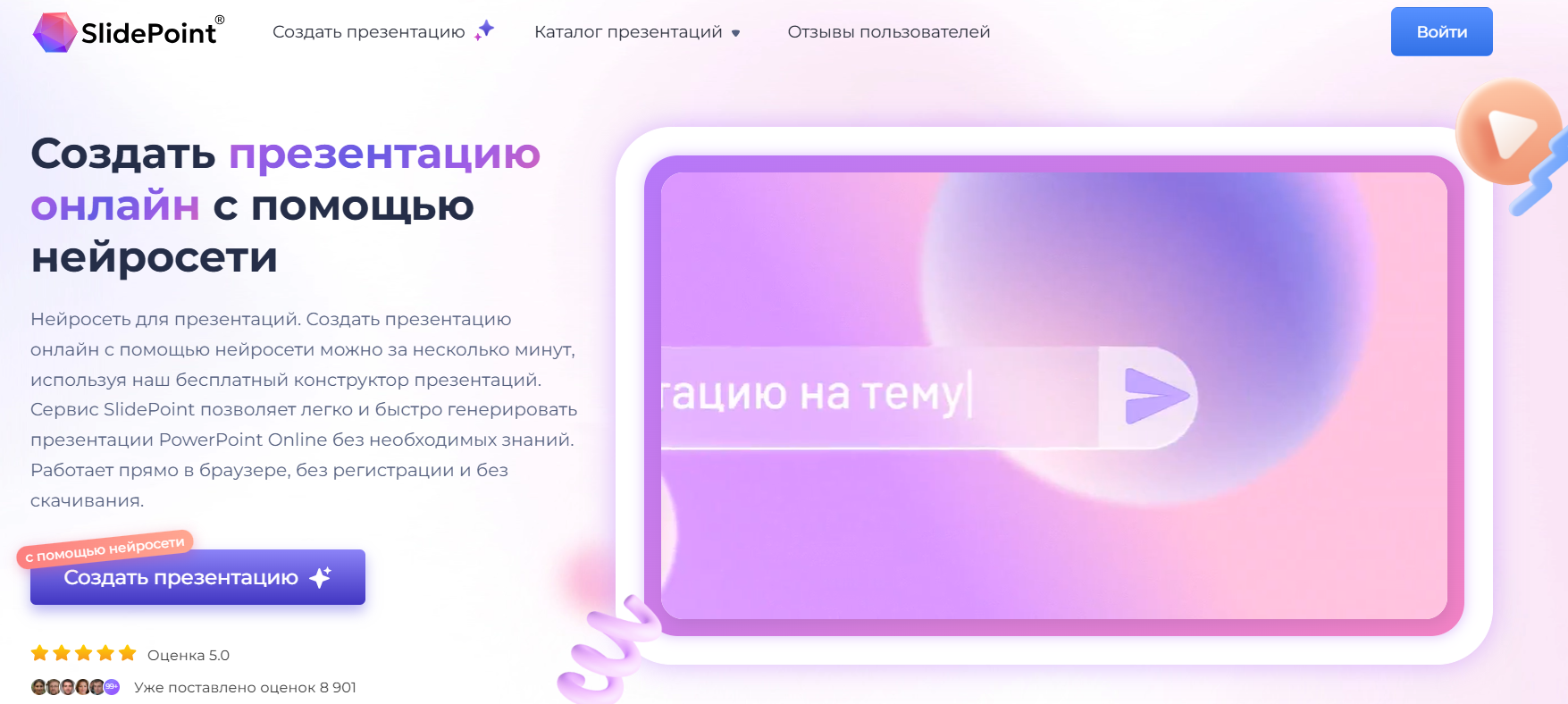 SlidePoint — российский сервис, который особенно хорошо справляется с академическими и научными презентациями. Разработчики сосредоточились на качественной обработке сложных текстов: дипломов, диссертаций, научных статей. Система понимает структуру академических работ, правильно выделяет цели, задачи, методы, результаты.
