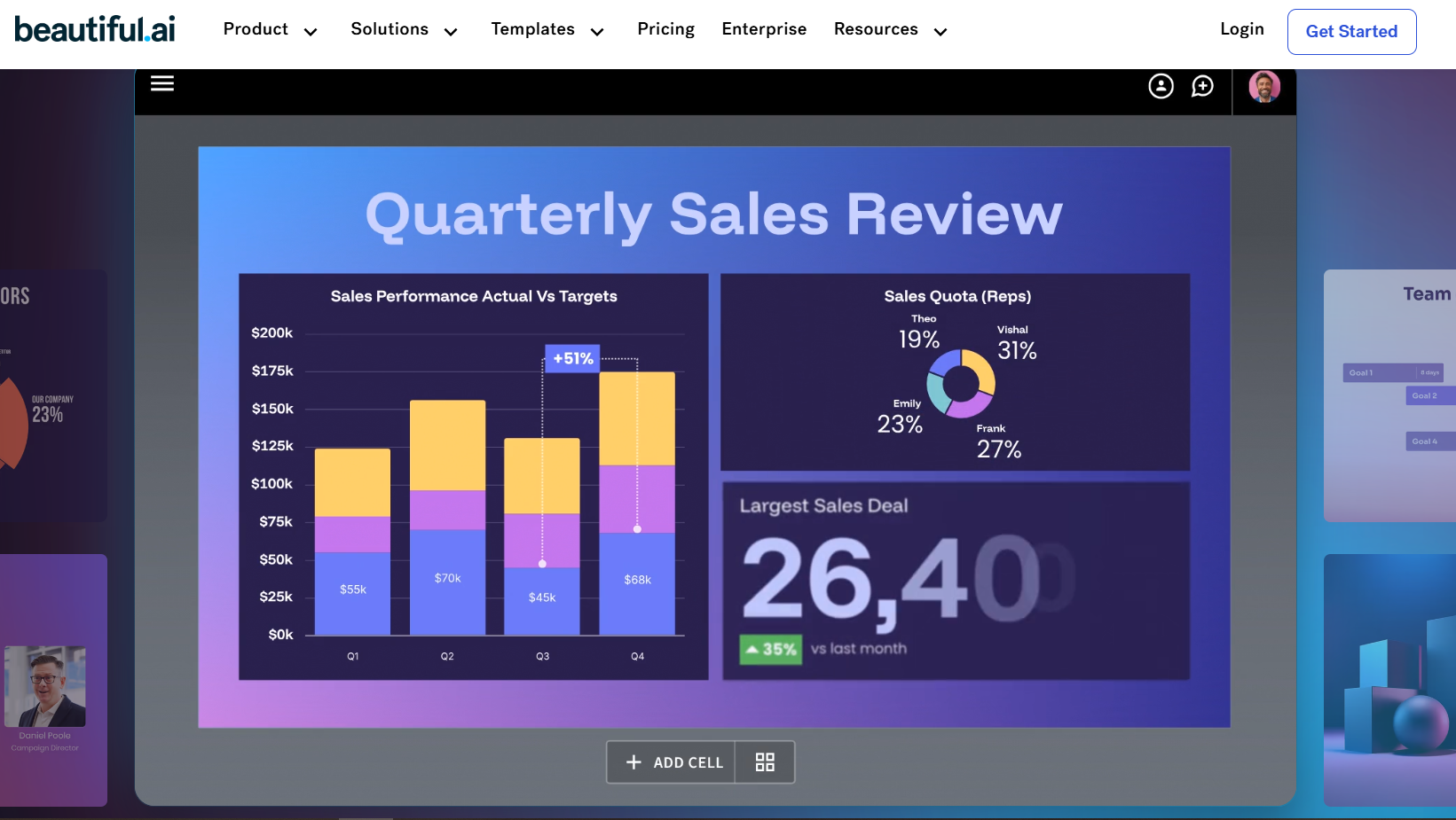 Beautiful AI специализируется на автоматическом создании дизайна. Вы добавляете контент, система сама создаёт профессиональное оформление, подбирает цвета, расставляет элементы. ИИ следит за соблюдением дизайн-принципов: контрастности, читаемости, баланса.