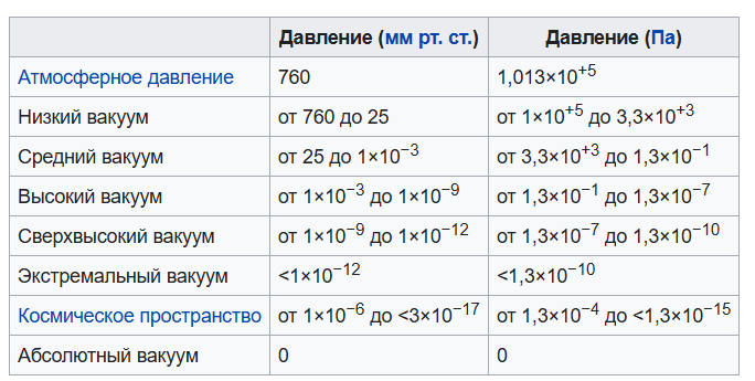 Но так и быть, просвещу: в промышленности и науки вакуум подразделяется на диапазоны характеризующиеся различным давлением. Глубокий вакуум, он же высокий вакуум, характерен давлением от 1,3×10−1 до 1,3×10−7 Паскаля.