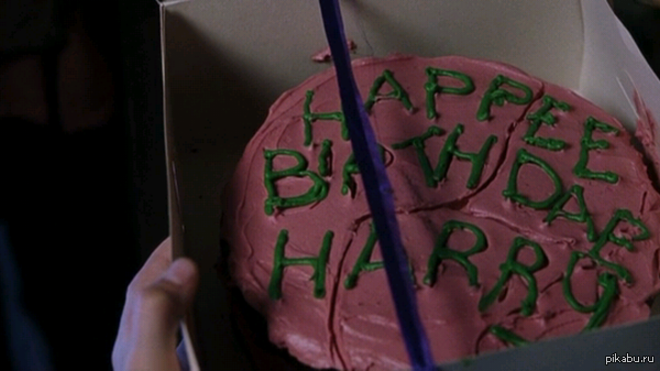Момент в первой части, когда Хагрид дарит Гарри торт собственного приготовления, и говорит, "сам испек и слова написал" , обратите внимание на слова