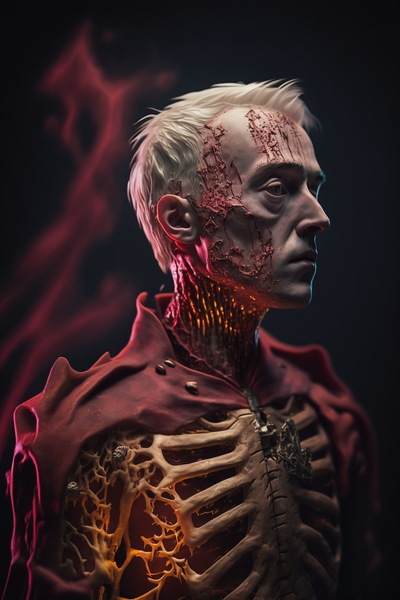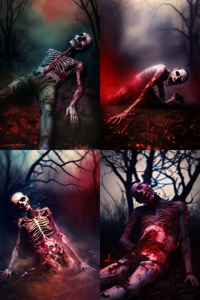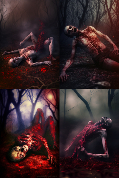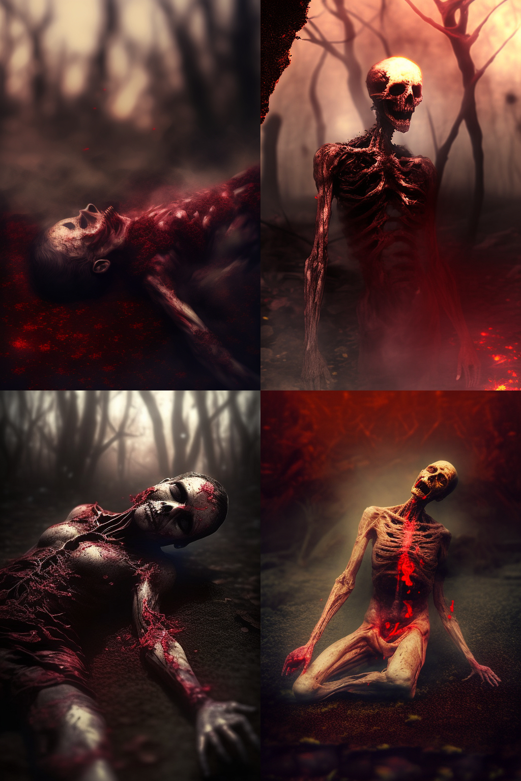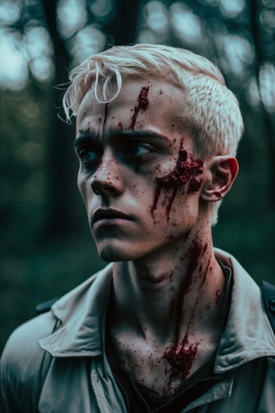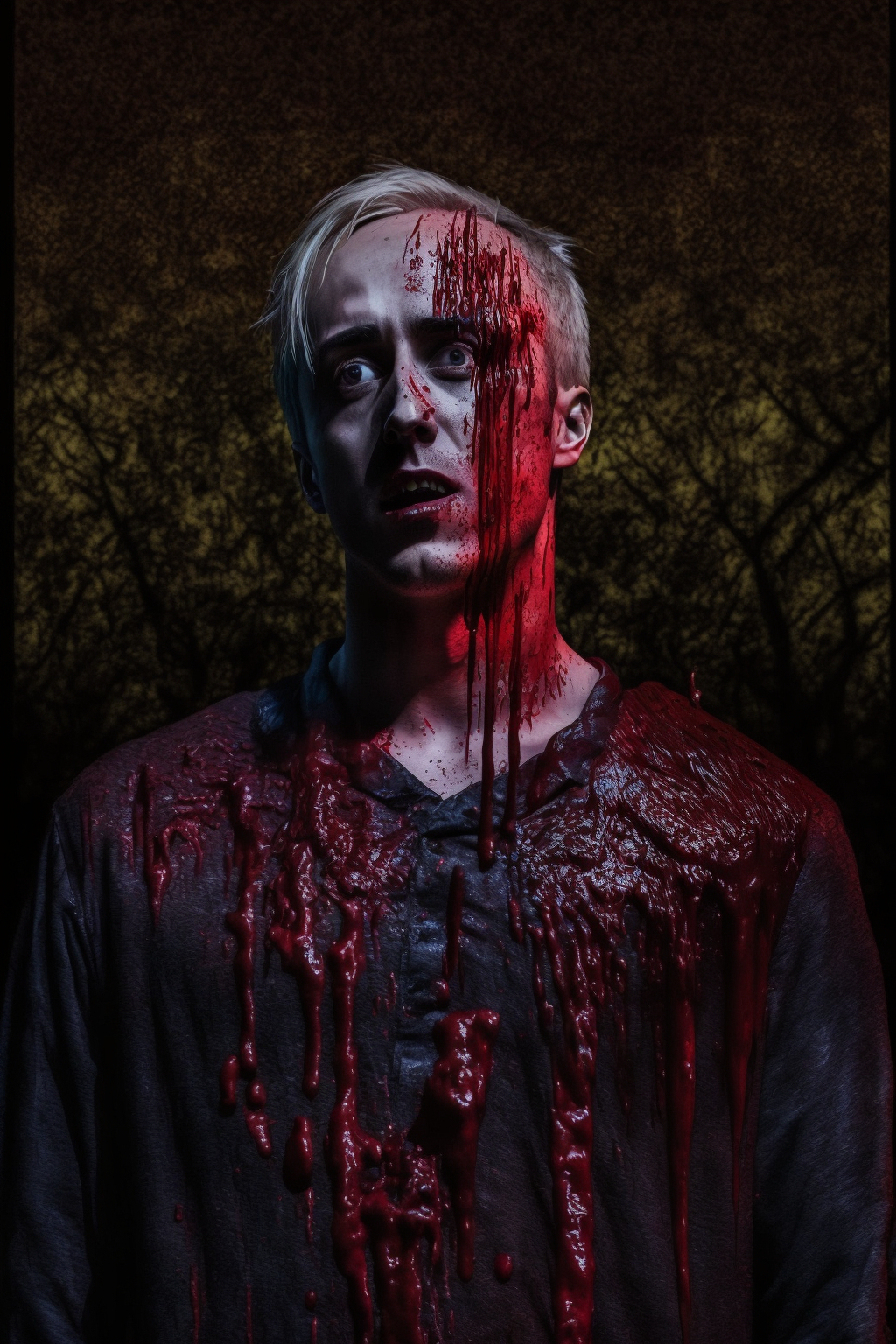 rotten Draco Malfoy by Tom Felton, partially skeletonized zombie, detached head lays on the ground, desolated forest, dark red liquid splashes, veins and arteries, aggresive, dark light, bokeh, large format, dusk dramatic light, heavy mist, thick fog, movie scene, dramatic --ar 2:3 --c 80 --v 4 --q 2 --s 750
