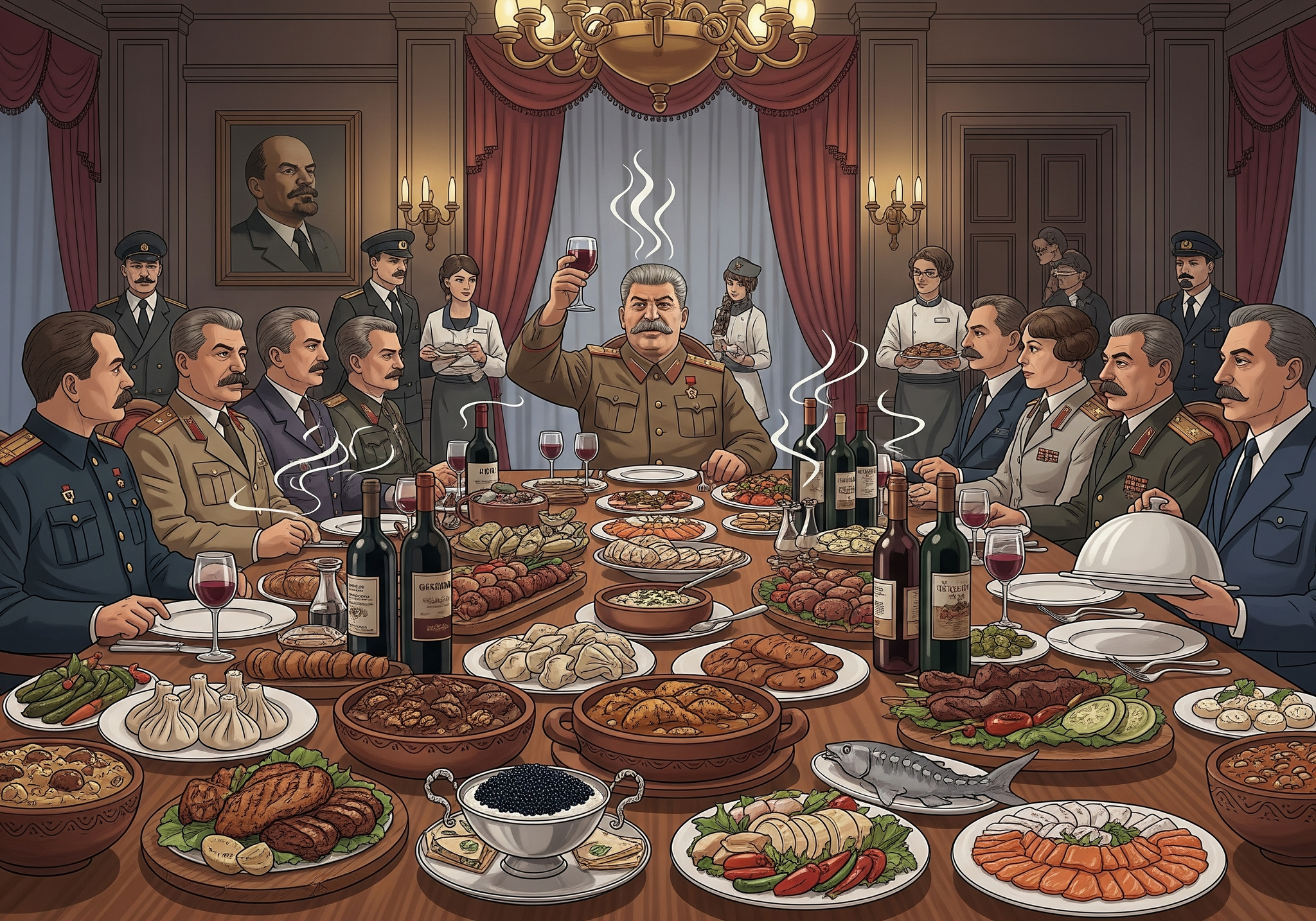 Тем не менее, праздничные застолья при Сталине были роскошными, не уступали царским банкетам прошлых эпох. На столах красовались осетровая и зернистая икра, красная рыба, изысканные мясные деликатесы, грузинские и кавказские сыры, разнообразные салаты, фрукты и маринады. Вино всегда было грузинским, хванчкара или киндзмараули, а тосты превращались в отдельное театральное действо.