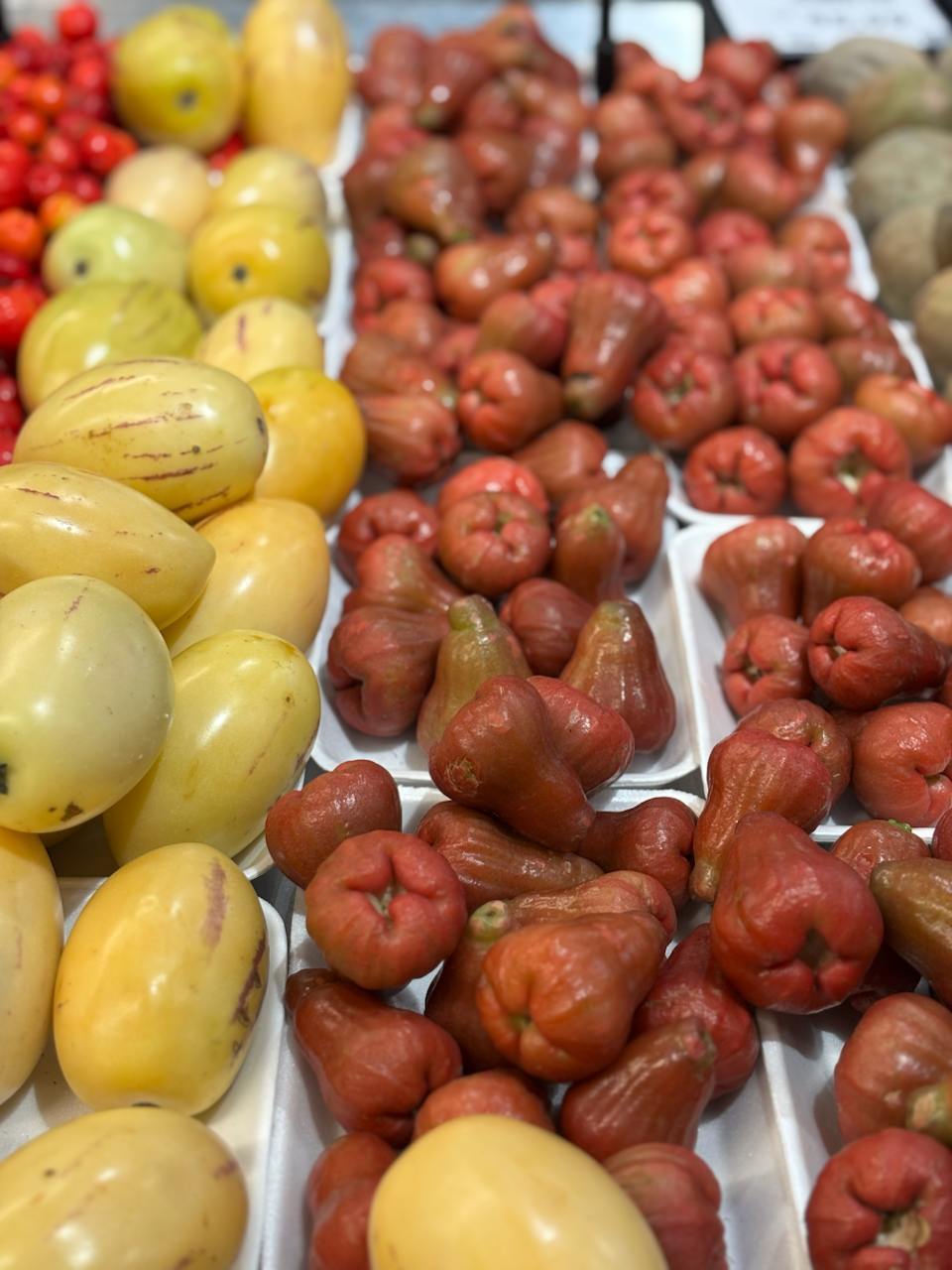 Жёлтые овальные — сладкий огурец. По вкусу что-то между дыней и огурцом. Красно-бордовые грушевидные — водяное яблоко, но на вкус как полая хрустящая груша
