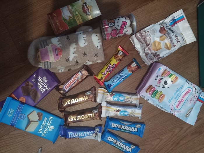 Открыла посылочку,а там... много много много вкусных конфет,вафелек и шоколада местного производства. А еще чай к этим вкусняшкам и носочки. Буду зимними вечерами сидеть в носках,пить чай и лопать конфеты.
