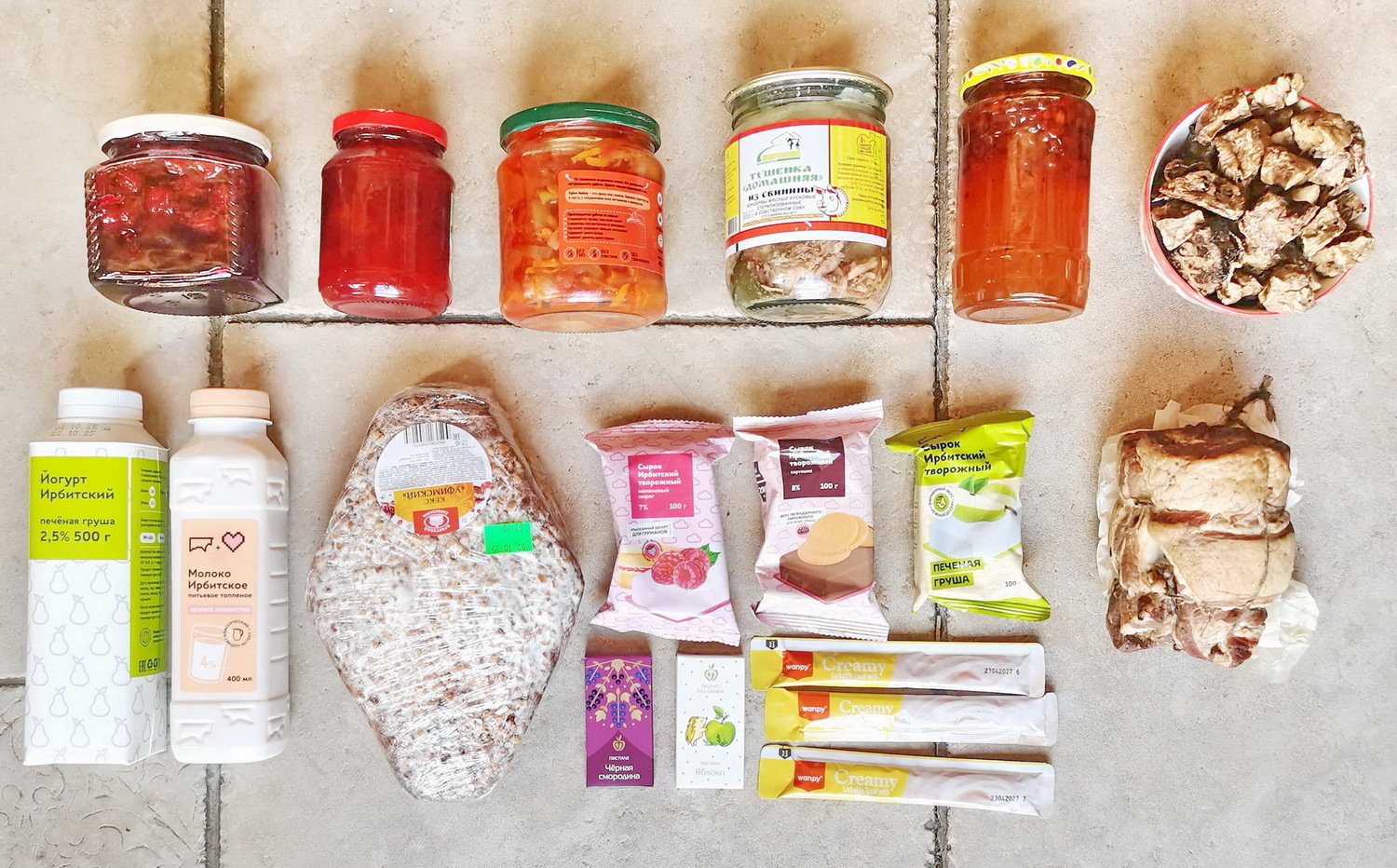 Слева направо: домашние варенья, урбеч из кешью, свиная тушёнка, варенье, вяленые лёгкие для кота, кефир, топлёное молоко, кекс, сырки, пастила, лакомства для кота, копчёная грудинка.