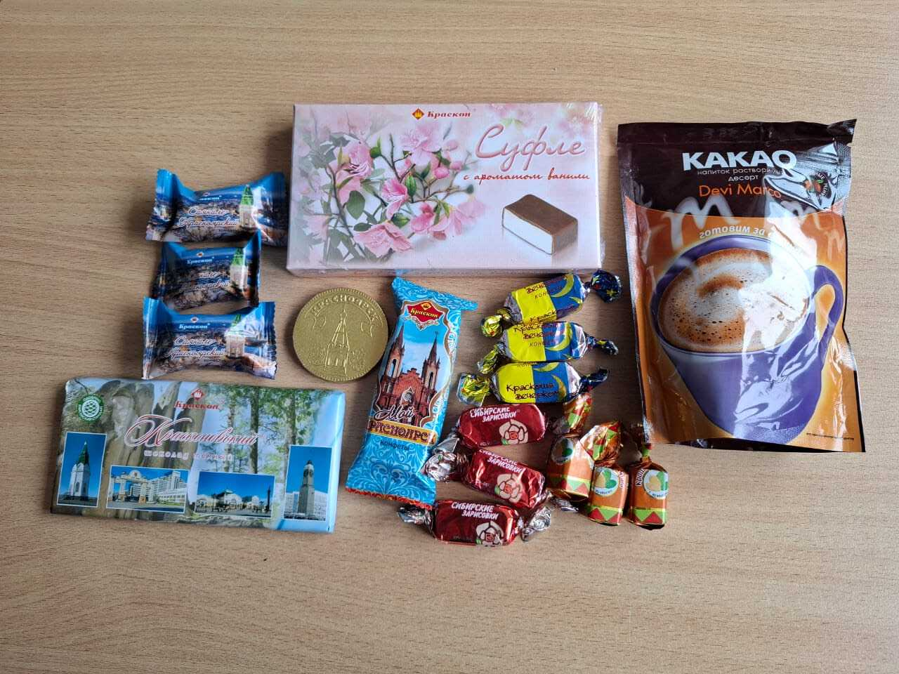 Тут у нас конфеты с местным колоритом: "Мой Красноярск", "Кракоша вечерком", "Крошка Кракошка", "Сибирские зарисовки", "Саянале Красноярский" и шоколадная медаль. Суфле в коробочке. И плитка шоколада с фотографиями города.