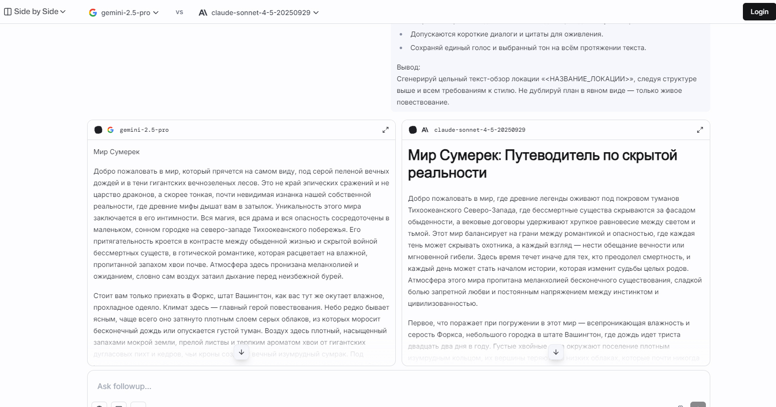 В левом меню выбираем Side by Side, чтобы получить ответ сразу от двух нейромоделей и выбрать тот, который понравится больше. Советую модели: Gemini Pro 2.5 и Claude Sonet 4.5