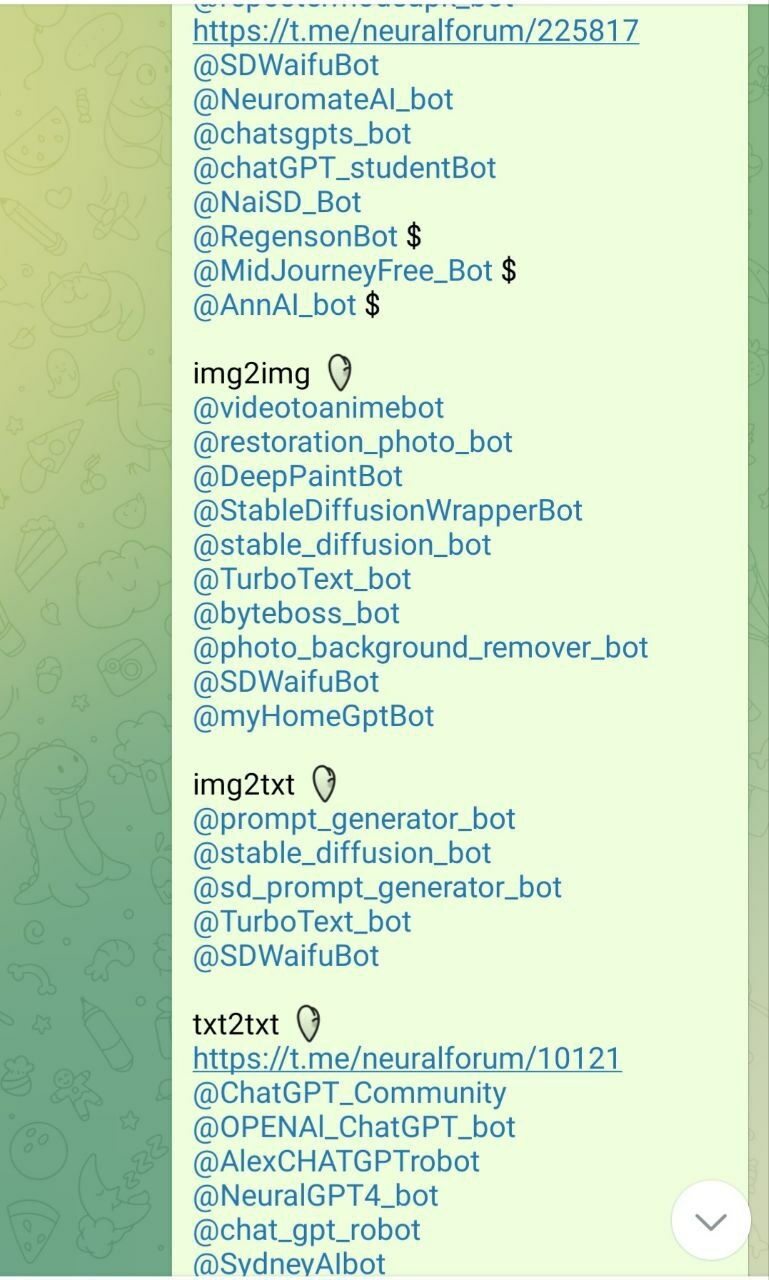 Боты умеют делать картинку по тексту (txt2img), картинку из картинки (img2img если вам надо шедевр сделать своим), текст из текста (txt2txt -программирование, поиск, полезняхи) и текст из картинки (img2txt для описания того, что на картинке).
