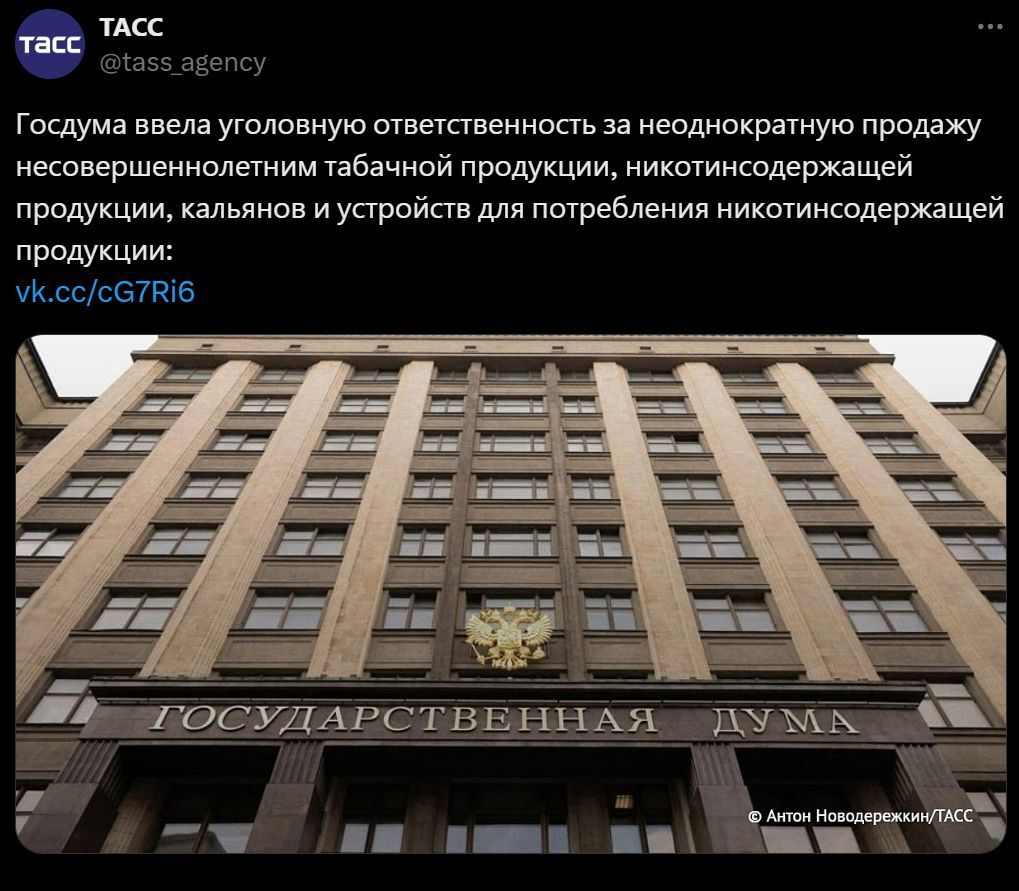 Госдума приняла на пленарном заседании сразу во втором и третьем чтениях законопроект о введении уголовной ответственности за неоднократную продажу несовершеннолетним табачной продукции, никотинсодержащей продукции, кальянов и устройств для потребления никотинсодержащей продукции.