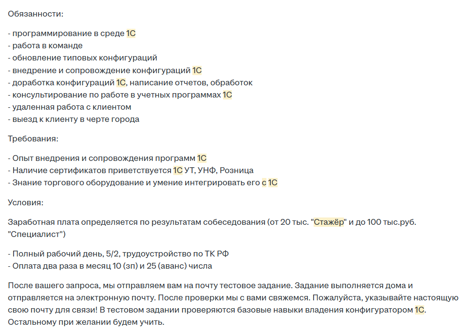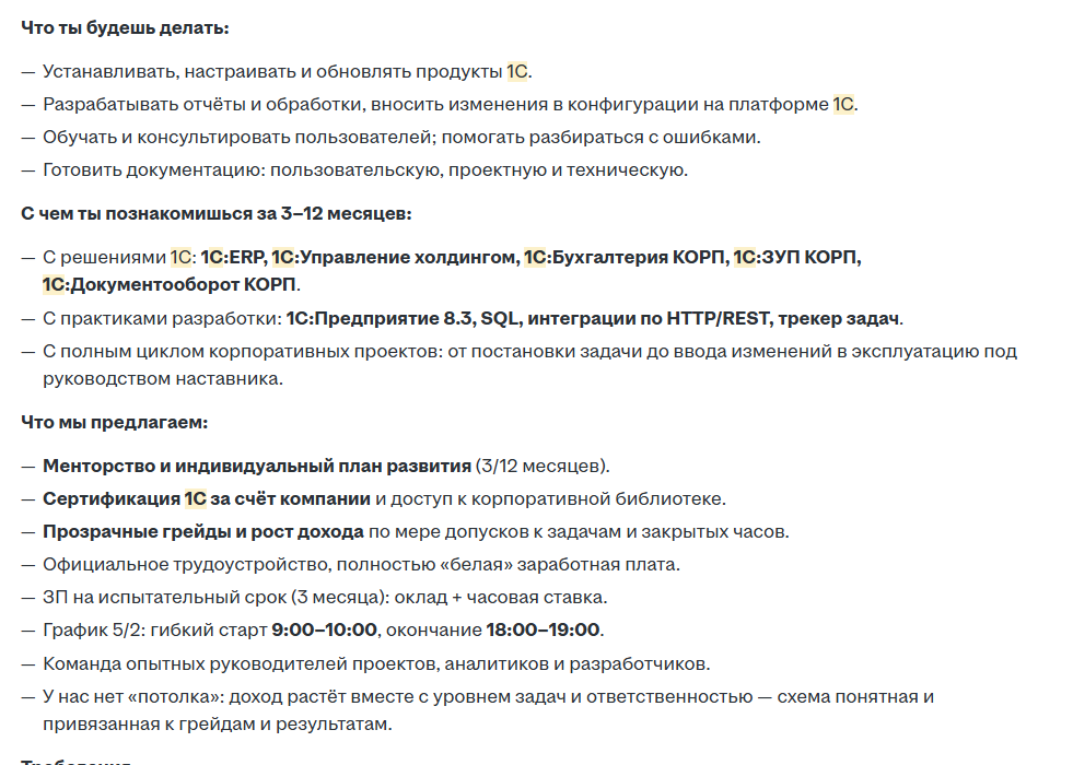 👍 Вакансия №4: еще один пример хорошей вакансии, которую стоит рассмотреть. Оклад указан 70 000 - 80 000. Понимают суть программиста 1С, удаленка и прочее. Как вам удобно, понимают что есть разные кандидаты с разных регионов. Видно что в составлении вакансии принимал участие непосредственно руководитель отдела разработки. Вери гуд!