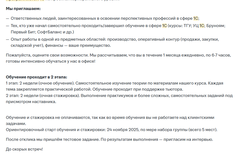 🧑🏭 Вы готовы даже некоторое время работать за небольшие деньги, чтобы в дальнейшем получить хорошую оплату труда. Искать нужно вакансии стажера/ученика/начинающего (нужное подчеркнуть). Подскажу важные моменты, на которые стоит обратить внимание: