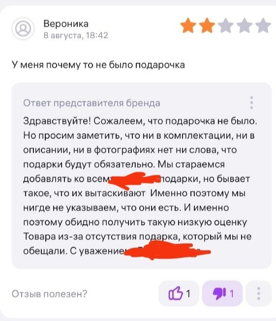 Убрала название продавца и товара, чтобы не сочли за рекламу. Итак, что мы имеем? Вы заплатили за товар, товар вас устроил (по крайней мере, в отзыве ничего о его качестве не написали). Но тут вы узнаете, что кому-то из покупателей достался подарок, а вам нет!!! Ужас, кошмар, несправедливость!