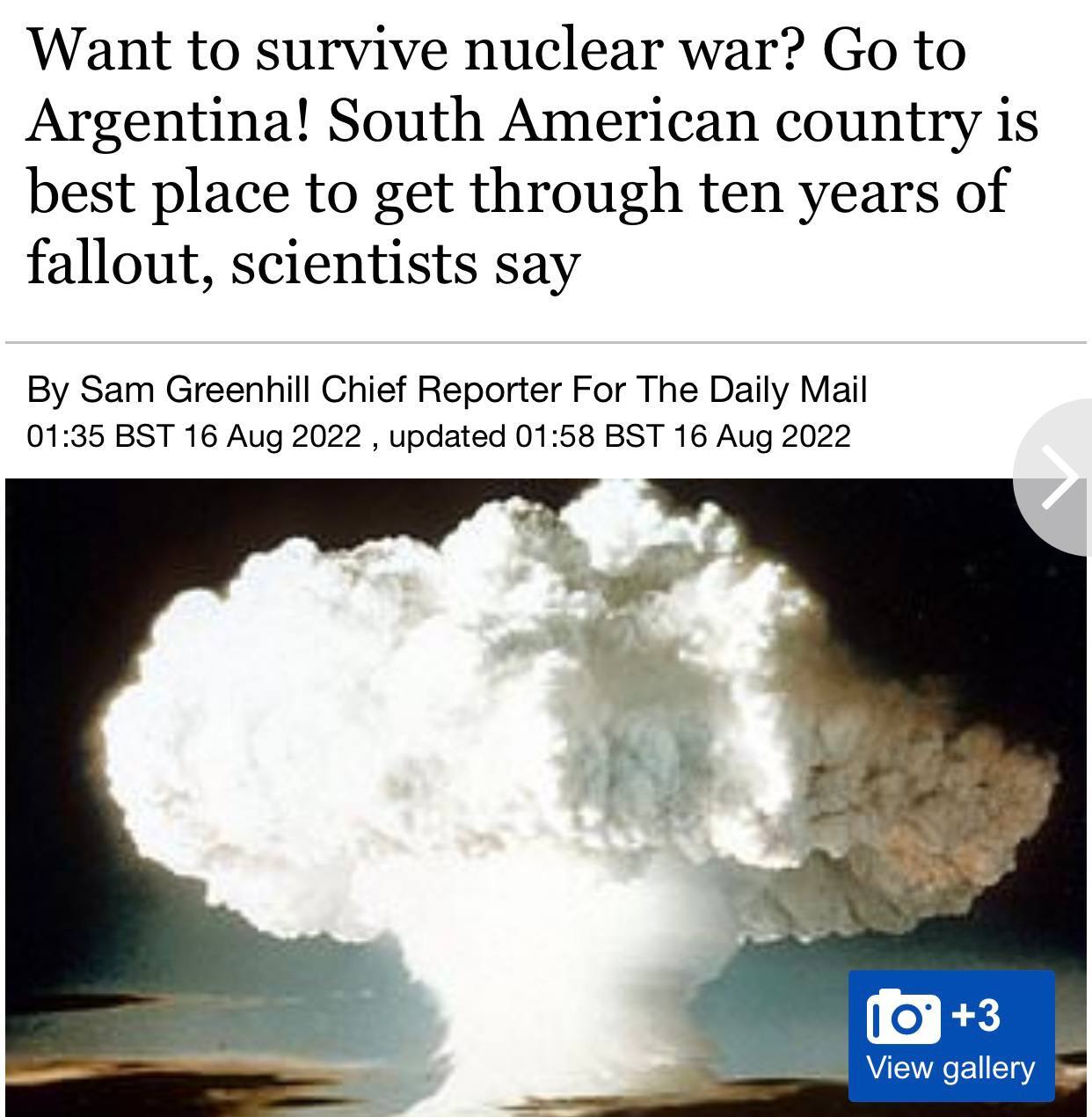«Хотите пережить ядерную войну? Отправляйтесь в Аргентину! Это лучшее место, чтобы пережить десять лет ядерных осадков»: Ученые задались вопросом, куда бежать, чтобы спастись в Третьей мировой, проанализировали компьютерную модель мира после атомной войны и пришли к выводу, что главная опасность постапокалипсиса – голод.