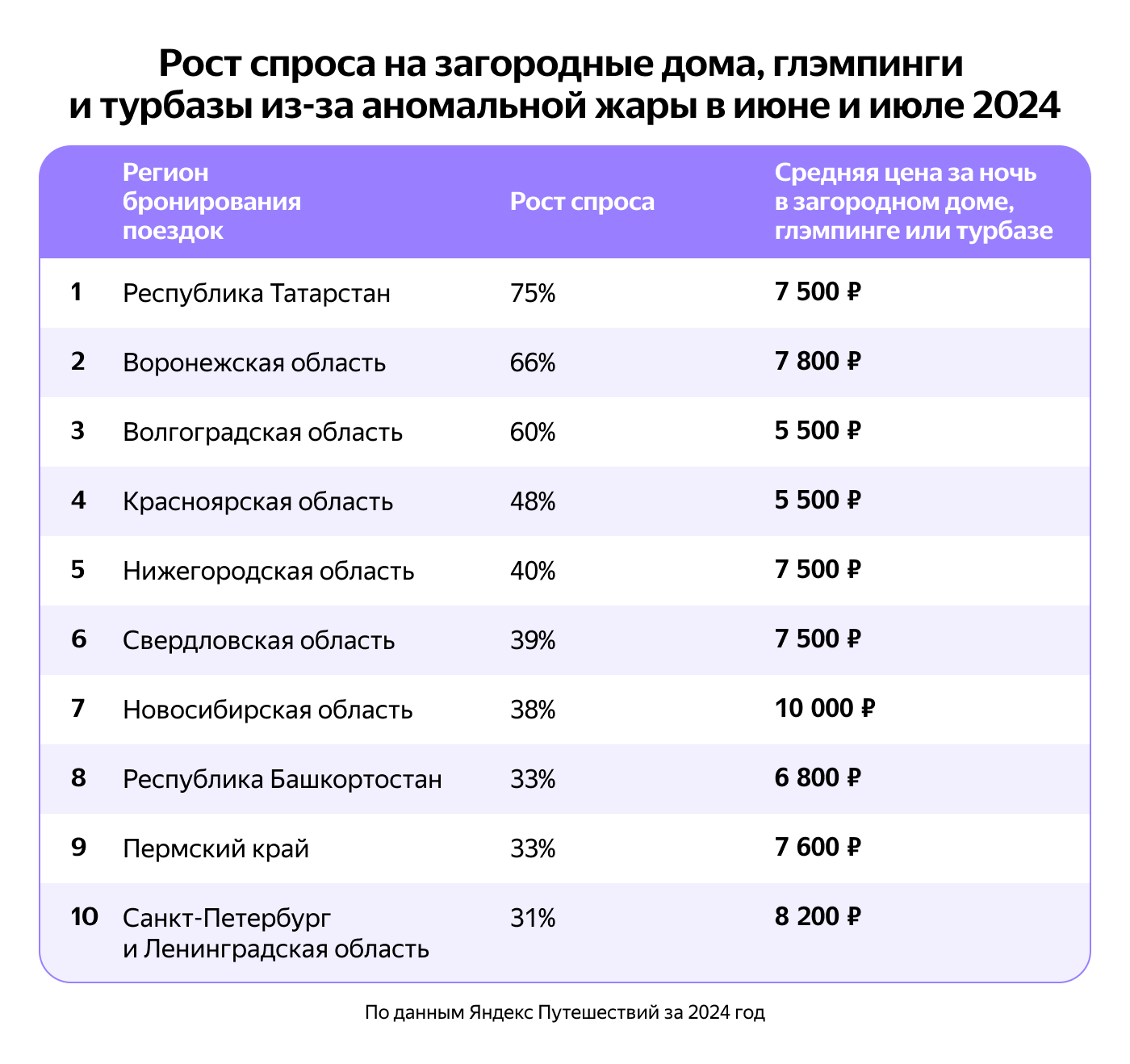 Чтобы спастись от духоты и зноя, большинство жителей городов сбегает на природу. Самым популярным выбором, где побыть в прохладе, в июле стали загородные дома: число отдыхающих увеличилось почти на 50%. На втором месте турбазы — их бронирует 31% пользователей. А вот любителей глэмпинга не так много: спрос на этот формат туризма вырос всего на 13%.