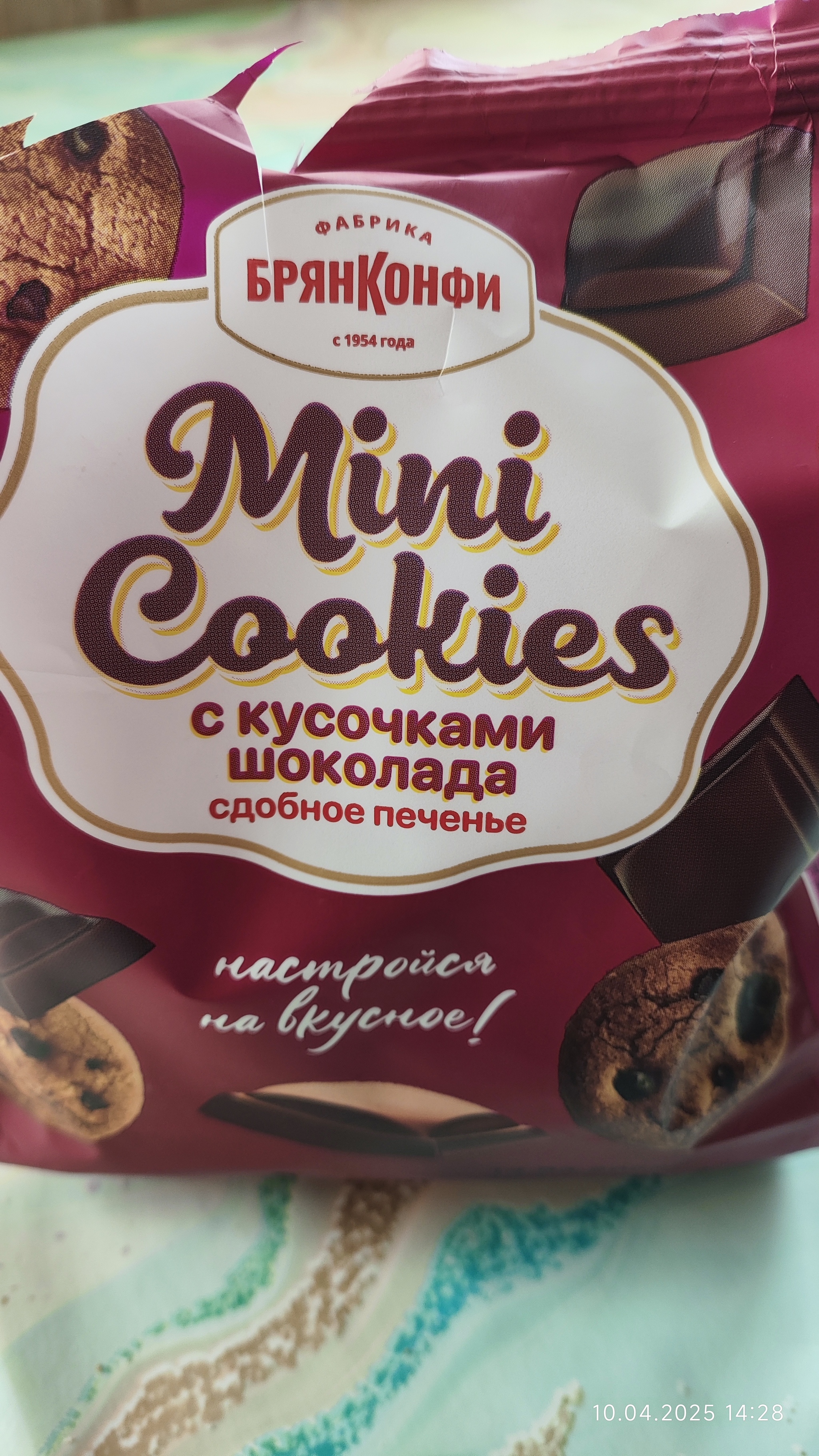 Так как мой ребёнок любит печенье с шоколадом, выбор пал на это печенье с кусочками шоколада, изготовитель АО "БРЯНКОНФИ". Фото упаковки ниже.