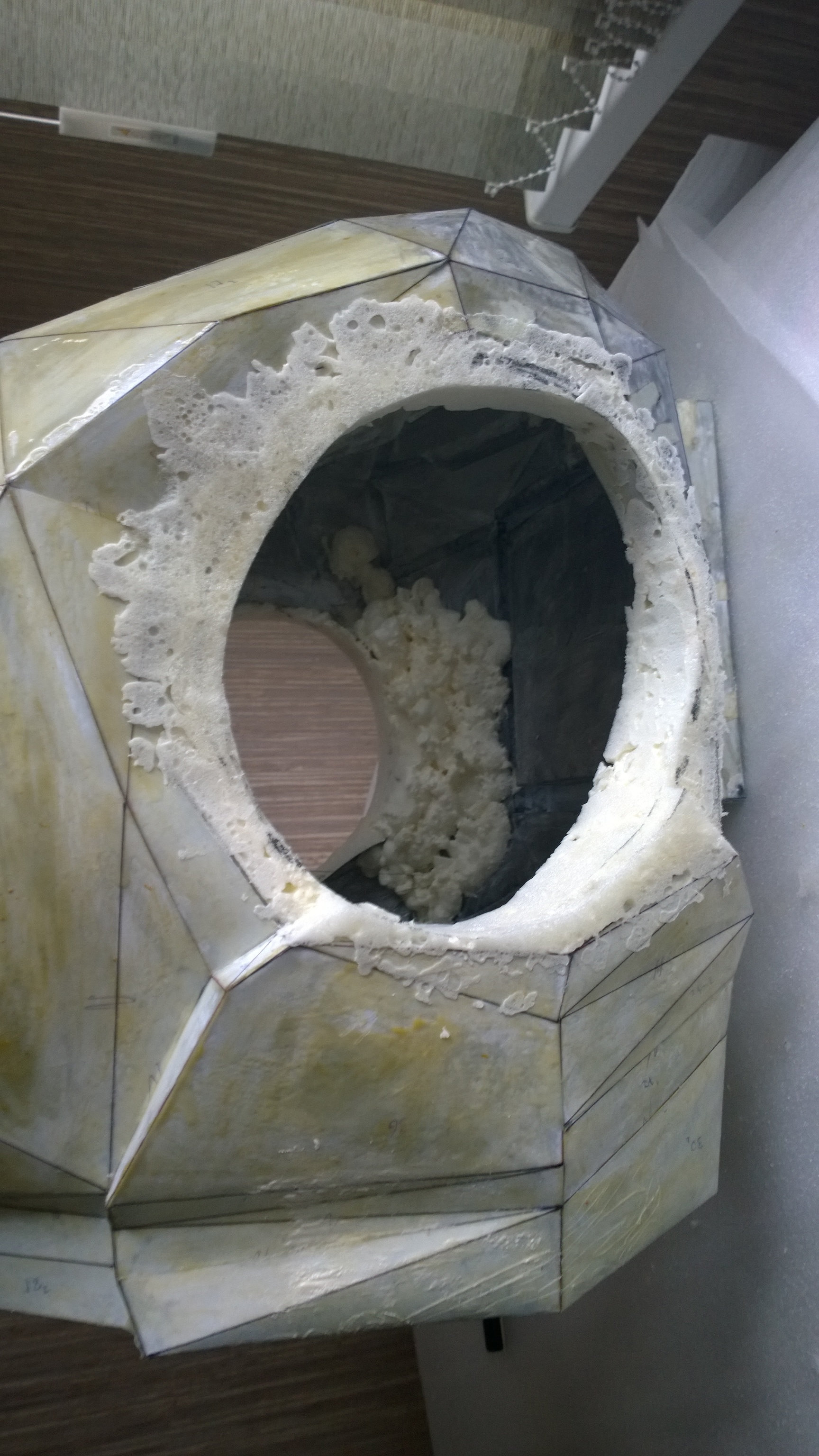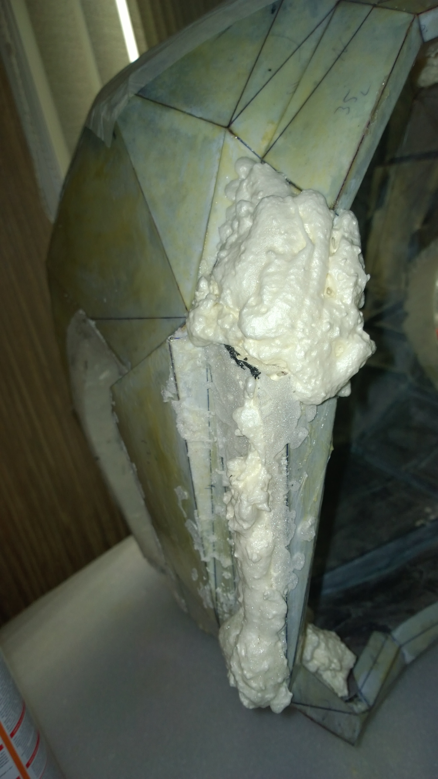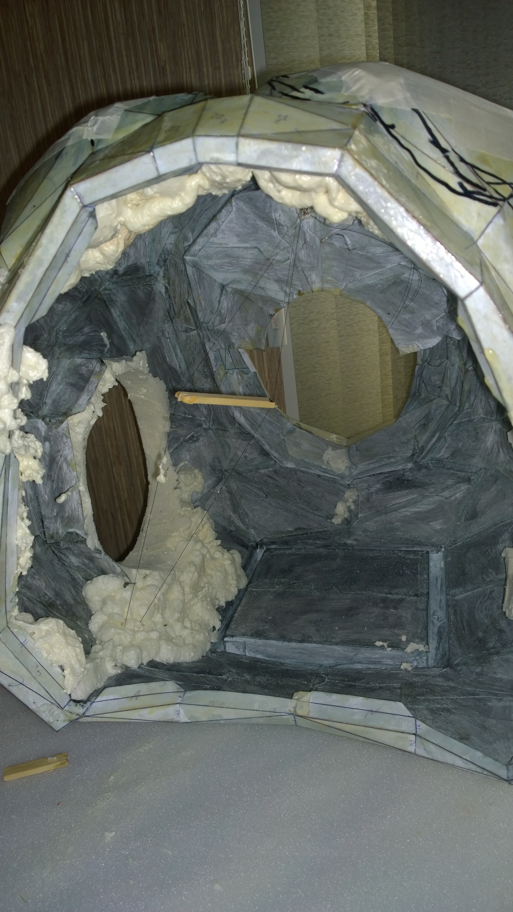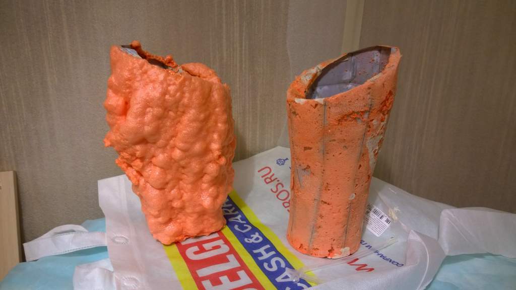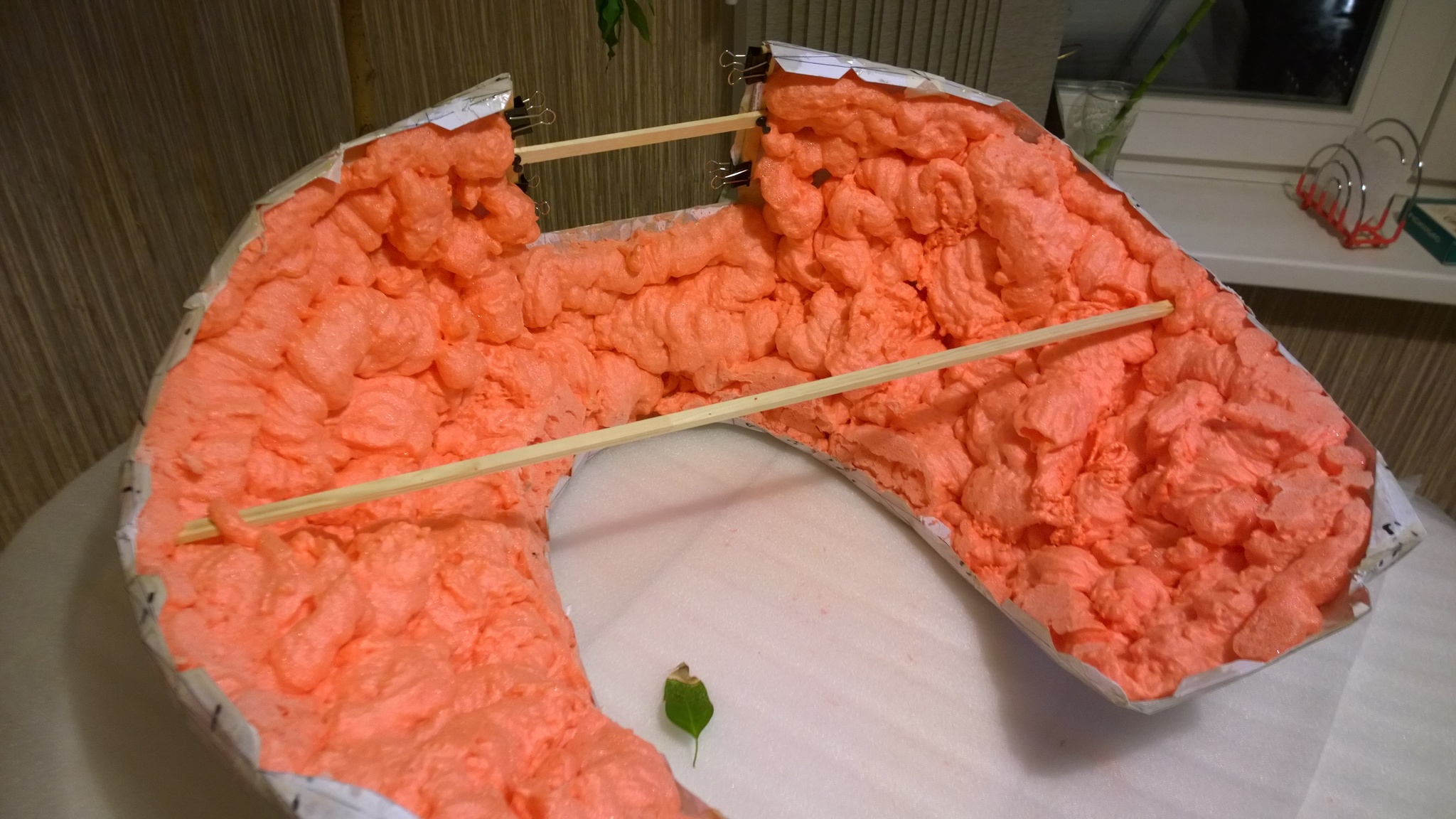 Сначала решили использовать монтажную пену для утепления стен: наносить её равномерным слоем на детали и срезать лишнее. Но прямота рук была прокачана слабо, поэтому сделать симметричные детали не получилось. Пена ложилась неровно, оставляя полости. В итоге было решено переделать саму 3D-модель и клеить почти все детали заново.